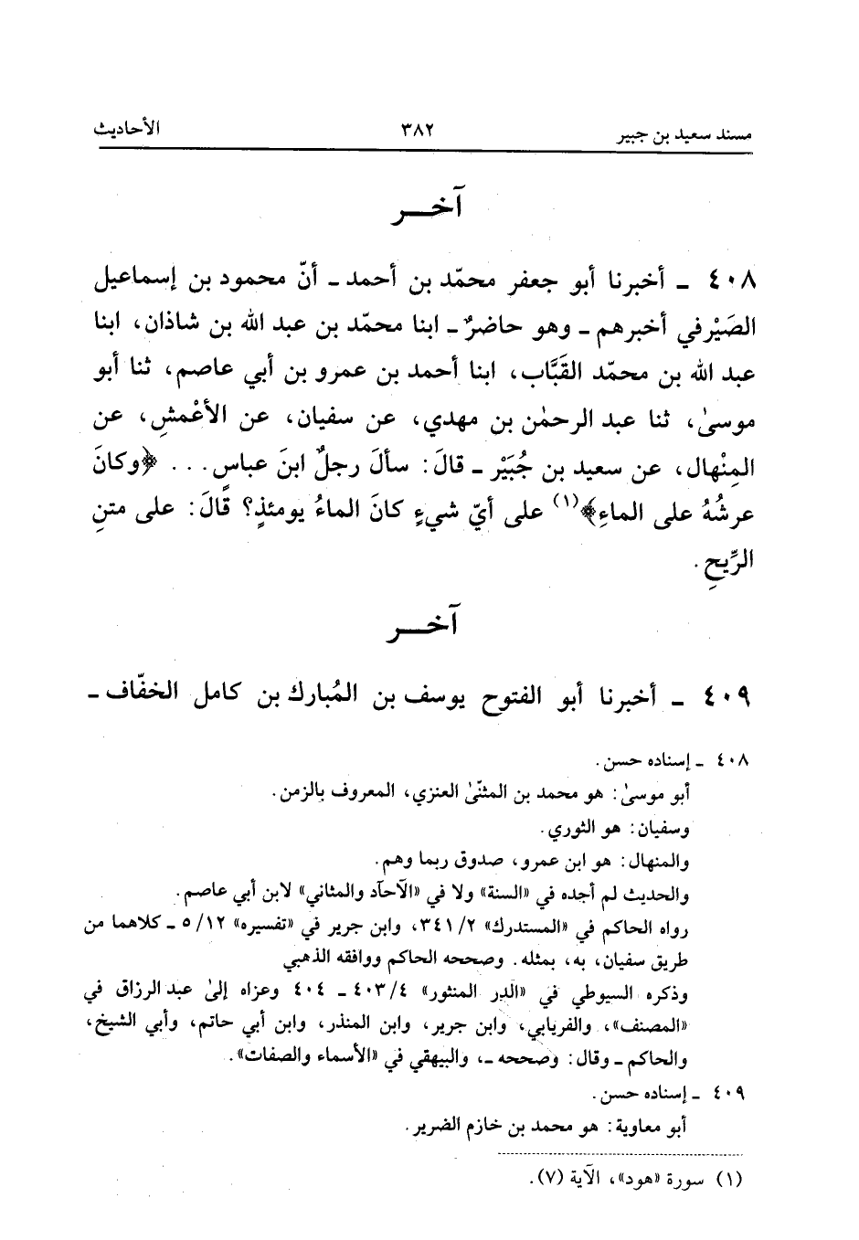 408 - أَخْبَرَنَا أَبُو جَعْفَرٍ مُحَمَّدُ بْنُ أَحْمَدَ أَنَّ مَحْمُودَ بْنَ إِسْمَاعِيلَ الصَّيْرَفِيَّ أَخْبَرَهُمْ وَهُوَ حَاضِرٌ أبنا مُحَمَّدُ بْنُ عَبْدِ اللَّهِ بْنِ شَاذَانَ أبنا عَبْدُ اللَّهِ بْنُ مُحَمَّدٍ الْقَبَّابُ أبنا أَحْمَدُ بْنُ عَمْرِو بْنِ أَبِي عَاصِمٍ ثَنَا أَبُو مُوسَى ثَنَا عَبْدُ الرَّحْمَنِ بْنُ مَهْدِيٍّ عَنْ سُفْيَانَ عَنِ الأَعْمَشِ عَنِ الْمِنْهَالِ عَنْ سَعِيدِ بْنِ جُبَيْرٍ قَالَ سَأَلَ رَجُلٌ ابْن عَبَّاس وَكَانَ عَرْشه على المَاء 1 عَلَى أَيِّ شَيْءٍ كَانَ الْمَاءُ يَوْمَئِذٍ قَالَ عَلَى مَتْنِ الرِّيحِ