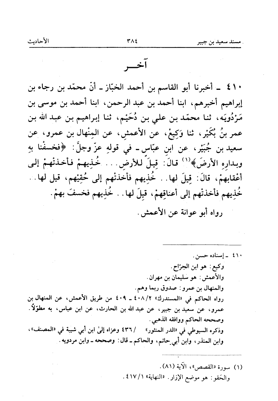 410 - أَخْبَرَنَا أَبُو الْقَاسِمِ بْنُ أَحْمَدَ الْخَبَّازُ أَنَّ مُحَمَّدَ بْنَ رَجَاءِ بْنِ إِبْرَاهِيمَ أبنا أَحْمَدُ بْنُ عَبْدِ الرَّحْمَنِ أبنا أَحْمَدُ بْنُ مُوسَى بْنِ مَرْدَوَيْهِ ثَنَا مُحَمَّدُ بْنُ عَلِيِّ بْنِ دُحَيْمٍ ثَنَا إِبْرَاهِيمُ بْنُ عَبْدِ اللَّهِ بْنِ عُمَرَ بْنِ بُكَيْرٍ ثَنَا وَكِيعٌ عَنِ الأَعْمَشِ عَنِ الْمِنْهَالِ بْنِ عَمْرٍو عَنْ سَعِيدِ بْنِ جُبَيْرٍ عَنِ ابْنِ عَبَّاسٍ فِي قَوْلِهِ عز وَجل {فَخَسَفْنَا بِهِ وَبِدَارِهِ الأَرْض} قَالَ قِيلَ لِلأَرْضِ خُذِيهِمْ فَأَخَذَتْهُمْ إِلَى أَعْقَابِهِمْ قَالَ قِيلَ لَهَا خُذِيهِمْ فَأَخَذَتْهُمْ إِلَى حِقِيِّهِمْ قِيلَ لَهَا خُذِيهِمْ فَأَخَذَتْهُمْ إِلَى أَعْنَاقِهِمْ قِيلَ لَهَا خُذِيهِمْ فَخُسِفَ بِهِمْ