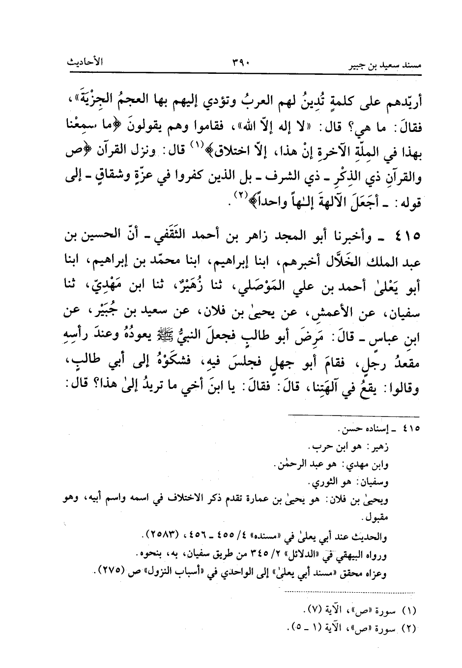 415 - وَأَخْبَرَنَا أَبُو الْمَجْدِ زَاهِرُ بْنُ أَحْمَدَ الثَّقَفِيُّ أَنَّ الْحُسَيْنَ بْنَ عَبْدِ الْمَلِكِ الْخَلالَ أَخْبَرَهُمْ أبنا إِبْرَاهِيمُ أبنا مُحَمَّدُ بْنُ إِبْرَاهِيمَ أبنا أَبُو يَعْلَى أَحْمَدُ بْنُ عَلِيٍّ الْمَوْصِلِيُّ ثَنَا زُهَيْرٌ ثَنَا ابْنُ مَهْدِيٍّ ثَنَا سُفْيَانُ عَنِ الأَعْمَشِ عَنْ يَحْيَى بْنِ فُلانٍ عَنْ سَعِيدِ بْنِ جُبَيْرٍ عَنِ ابْنِ عَبَّاسٍ قَالَ مَرِضَ أَبُو طَالِبٍ فَجَعَلَ النَّبِيُّ صَلَّى اللَّهُ عَلَيْهِ وَسَلَّمَ يَعُودُهُ وَعِنْدَ رَأْسِهِ مِقْعَدُ رَجُلٍ فَقَامَ أَبُو جَهْلٍ فَجَلَسَ فِيهِ فَشَكَوْهُ إِلَى أَبِي طَالِبٍ وَقَالُوا يَقَعُ فِي آلِهَتِنَا قَالَ فَقَالَ يَا ابْن أَخِي مَا تُرِيدُ إِلَى هَذَا قَالَ