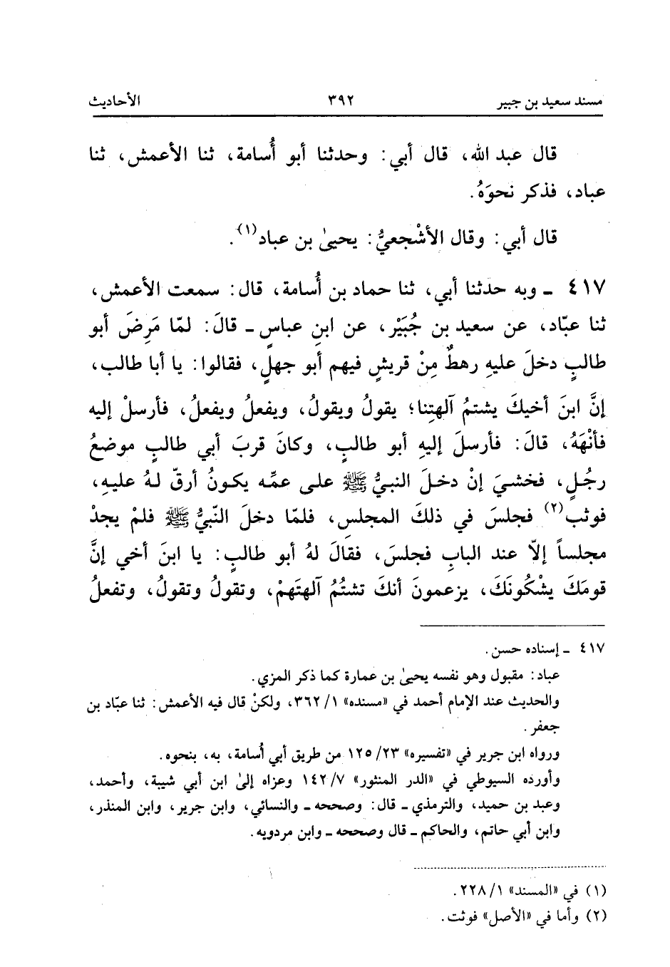 417 - وَبِهِ حَدَّثَنَا أَبِي ثَنا حَمَّادُ بْنُ أُسَامَةَ قَالَ سَمِعْتُ الأَعْمَشَ ثَنَا عَبَّادٌ عَنْ سَعِيدُ بْنُ جُبَيْرٍ عَنِ ابْنِ عَبَّاسٍ قَالَ لَمَّا مَرِضَ أَبُو طَالِبٍ دَخَلَ عَلَيْهِ رَهْطٌ مِنْ قُرَيْشٍ فِيهِمْ أَبُو جَهْلٍ فَقَالُوا يَا أَبَا طَالِبٍ إِنَّ ابْنَ أَخِيكَ يَشْتُمُ آلِهَتَنَا يَقُولُ وَيَقُولُ وَيَفْعَلُ وَيَفْعَلُ فَأَرْسِلْ إِلَيْهِ فَانْهَهُ قَالَ فَأَرْسَلَ إِلَيْهِ أَبُو طَالِبٍ وَكَانَ قُرْبَ أَبِي طَالِبٍ مَوْضِعُ رَجُلٍ فَخَشِيَ إِنْ دَخَلَ النَّبِيُّ صَلَّى اللَّهُ عَلَيْهِ وَسَلَّمَ عَلَى عَمِّهِ يَكُونُ أَرَقَّ لَهُ عَلَيْهِ فَوَثَبَ فَجَلَسَ فِي ذَلِكَ الْمَجْلِسِ فَلَمَّا دَخَلَ النَّبِيُّ صَلَّى اللَّهُ عَلَيْهِ وَسَلَّمَ فَلَمْ يَجِدْ مَجْلِسًا إِلا عِنْدَ الْبَاب فَجَلَسَ فَقَالَ لَهُ أَبُو طَالب يَا ابْن أَخِي إِنَّ قَوْمَكَ يَشْكُونَكَ يَزْعُمُونَ أَنَّكَ تَشْتُمُ آلِهَتَهُمْ وَتَقُولُ وَتَقُولُ وَتَفْعَلُ