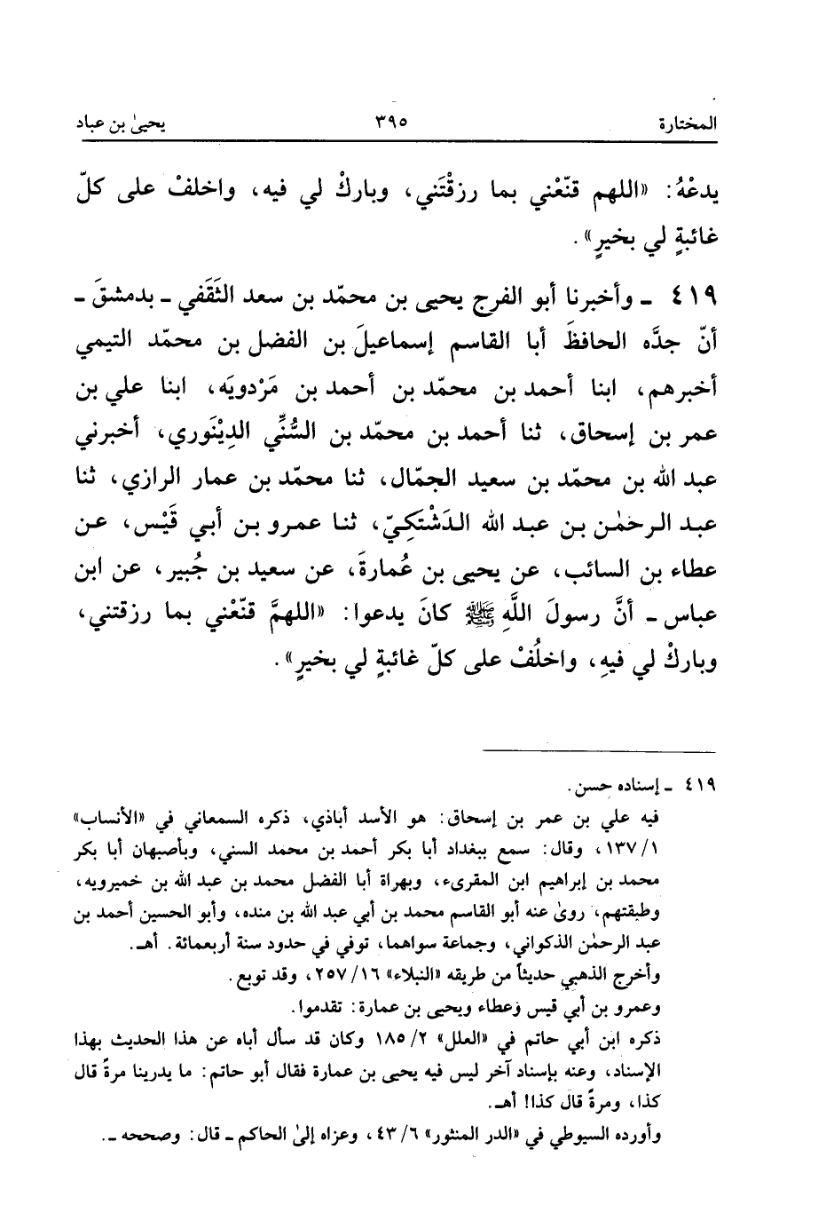 419 - وَأَخْبَرَنَا أَبُو الْفَرَجِ يَحْيَى بْنُ مُحَمَّدِ بْنِ سَعْدٍ الثَّقَفِيُّ بِدِمَشْقَ أَنَّ جَدَّهُ الْحَافِظَ أَبَا الْقَاسِمِ إِسْمَاعِيلَ بْنَ الْفَضْلِ بْنِ مُحَمَّدٍ التَّيْمِيَّ أَخْبَرَهُمْ أبنا أَحْمَدُ بْنُ مُحَمَّدِ بْنِ أَحْمَدَ بْنِ مَرْدَوَيْهِ أبنا عَلِيُّ بْنُ عُمَرَ بْنِ إِسْحَاقَ ثَنَا أَحْمَدُ بْنُ مُحَمَّدٍ السُّنِّيُّ الدِّينَوَرِيُّ أَخْبَرَنِي عَبْدُ اللَّهِ بْنُ مُحَمَّدِ بْنِ سَعِيدٍ الْجَمَّالُ ثَنَا مُحَمَّدُ بْنُ عَمَّارٍ الرَّازِيُّ ثَنَا عَبْدُ الرَّحْمَنِ بْنُ عَبْدِ اللَّهِ الدَّشْتَكِيُّ ثَنَا عمروة بْنُ أَبِي قَيْسٍ عَنْ عَطَاءِ بْنِ السَّائِبِ عَنْ يَحْيَى بْنِ عُمَارَةَ عَنْ سَعِيدِ بْنِ جُبَيْرٍ عَنِ ابْنِ عَبَّاسٍ أَنَّ رَسُولَ اللَّهِ صلى الله عَلَيْهِ وَسلم كَانَ يدعوا اللَّهُمَّ قَنِّعْنِي بِمَا رَزَقْتَنِي وَبَارِكْ لِي فِيهِ وَاخْلُفْ عَلَى كُلِّ غَائِبَةٍ لِي بِخَيْرٍ