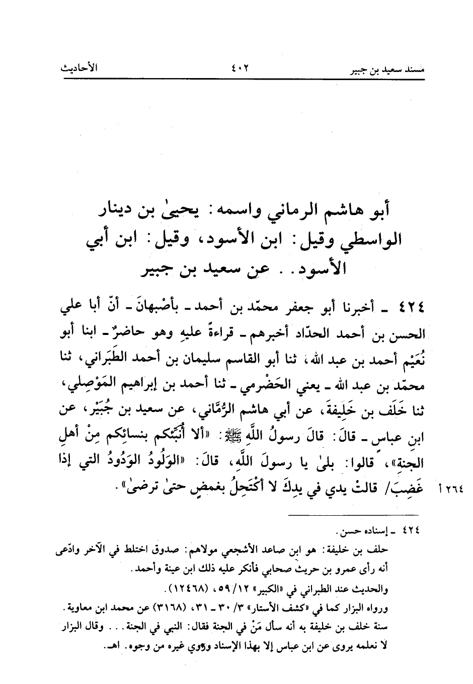 424 - أَخْبَرَنَا أَبُو جَعْفَرٍ مُحَمَّدُ بْنُ أَحْمَدَ بِأَصْبَهَانَ أَنَّ أَبَا عَلِيٍّ الْحَسَنَ بْنَ أَحْمَدَ الْحَدَّادَ أَخْبَرَهُمْ قِرَاءَةً عَلَيْهِ وَهُوَ حَاضِرٌ أبنا أَبُو نُعَيْمٍ أَحْمَدُ بْنُ عَبْدِ اللَّهِ ثَنَا أَبُو الْقَاسِمِ سُلَيْمَانُ بْنُ أَحْمَدَ الطَّبَرَانِيُّ ثَنَا مُحَمَّدُ بْنُ عَبْدِ اللَّهِ يَعْنِي الْحَضْرَمِيَّ ثَنَا أَحْمَدُ بْنُ إِبْرَاهِيمَ الْمَوْصِلِيُّ ثَنَا خَلَفُ بْنُ خَلِيفَةَ عَنْ أَبِي هَاشِمٍ الرُّمَّانِيِّ عَنْ سَعِيدِ بْنِ جُبَيْرٍ عَنِ ابْنِ عَبَّاسٍ قَالَ قَالَ رَسُولُ اللَّهِ صَلَّى اللَّهُ عَلَيْهِ وَسَلَّمَ أَلا أُنَبِّئُكُمْ بِنِسَائِكُمْ مِنْ أَهْلِ الْجَنَّةِ قَالُوا بَلَى يَا رَسُولَ اللَّهِ قَالَ الْوَلُودُ الْوَدُودُ الَّتِي إِذَا غَضِبَ قَالَتْ يَدِي فِي يَدِكَ لَا أَكْتَحِلُ بِغِمْضٍ حَتَّى تَرْضَى