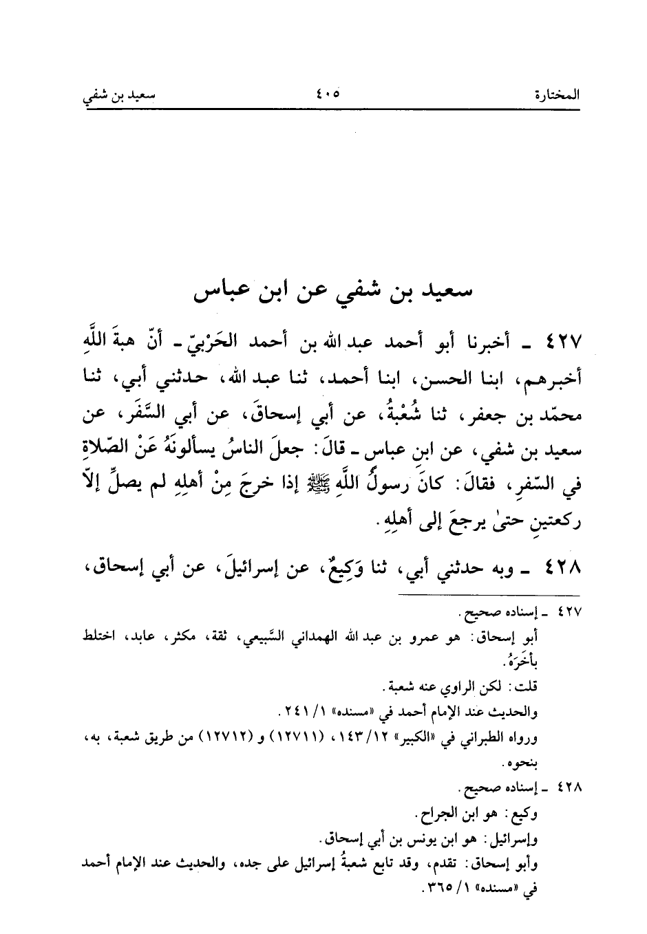 427 - أَخْبَرَنَا أَبُو أَحْمَدَ عَبْدُ اللَّهِ بْنُ أَحْمَدَ الْحَرْبِيُّ أَنَّ هِبَةَ اللَّهِ أَخْبَرَهُمْ أبنا الْحَسَنُ أبنا أَحْمَدُ ثَنَا عَبْدُ اللَّهِ حَدَّثَنِي أَبِي ثَنَا مُحَمَّدُ بْنُ جَعْفَرٍ ثَنَا شُعْبَةُ عَنْ أَبِي إِسْحَاقَ عَنْ أَبِي السَّفَرِ عَنْ سَعِيدِ بْنِ شَفِيٍّ عَنِ ابْنِ عَبَّاسٍ قَالَ جَعَلَ النَّاسُ يَسْأَلُونَهُ عَنِ الصَّلاةِ فِي السَّفَرِ فَقَالَ كَانَ رَسُولِ اللَّهِ صَلَّى اللَّهُ عَلَيْهِ وَسَلَّمَ إِذَا خَرَجَ مِنْ أَهْلِهِ لَمْ يُصَلِّ إِلا رَكْعَتَيْنِ حَتَّى يَرْجِعَ إِلَى أَهْلِهِ