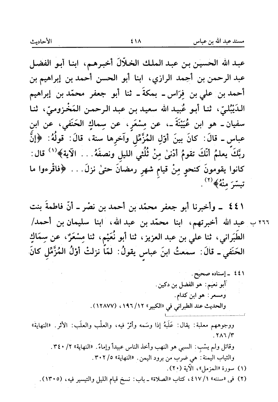 441 - وَأَخْبَرَنَا أَبُو جَعْفَرٍ مُحَمَّدُ بْنُ أَحْمَدَ بْنِ نَصْرٍ أَنَّ فَاطِمَةَ بِنْتَ عَبْدِ اللَّهِ أَخْبَرَتْهُمْ أبنا مُحَمَّدُ بْنُ عَبْدِ اللَّهِ أبنا سُلَيْمَانُ بْنُ أَحْمَدَ الطَّبَرَانِيُّ ثَنَا عَلِيُّ بْنُ عَبْدِ الْعَزِيزِ ثَنَا أَبُو نُعَيْمٍ ثَنَا مِسْعَرٌ عَنْ سِمَاكٍ الْحَنَفِيِّ قَالَ سَمِعْتُ ابْنَ عَبَّاسٍ يَقُولُ لَمَّا نَزَلَتْ أَوَّلُ الْمُزَّمِّلِ كَانَ قِيَامُهُمْ مِثْلَ قِيَامِهِمْ فِي رَمَضَانَ أَوْ نَحْوَ قِيَامِهِمْ فِي رَمَضَانَ وَكَانَ بَيْنَ أَوَّلِهَا وَآخِرِهَا سَنَةٌ