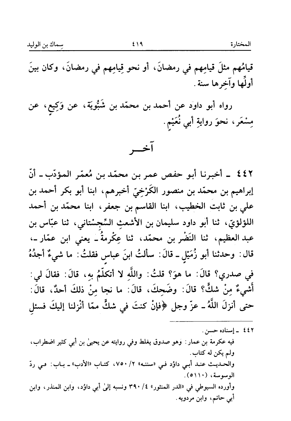 442 - أَخْبَرَنَا أَبُو حَفْصٍ عُمَرُ بْنُ مُحَمَّدِ بْنِ مَعْمَرٍ الْمُؤَدِّبُ أَنَّ إِبْرَاهِيمَ بْنَ مُحَمَّدِ بْنِ مَنْصُورٍ الْكَرْخِيَّ أَخْبَرَهُمْ أبنا أَبُو بَكْرٍ أَحْمَدُ بُنْ عَلِيِّ بْنِ ثَابِتٍ الْخَطِيبُ أبنا الْقَاسِمُ بْنُ جَعْفَرٍ أبنا مُحَمَّدُ بْنُ أَحْمَدَ اللؤْلُؤِي ثَنَا أَبُو دَاوُدَ سُلَيْمَانُ بْنُ الأَشْعَثِ السِّجِسْتَانِيُّ ثَنَا عَبَّاسُ بْنُ عَبْدِ الْعَظِيمِ ثَنَا النَّضْرُ بْنُ مُحَمَّدٍ ثَنَا عِكْرِمَةُ يَعْنِي ابْنَ عَمَّارٍ قَالَ وَحَدَّثَنَا أَبُو زُمَيْلٍ قَالَ سَأَلْتُ ابْنَ عَبَّاسٍ فَقُلْتُ مَا شَيْءٌ أَجِدُهُ فِي صَدْرِي قَالَ مَا هُوَ قُلْتُ وَاللَّهِ لَا أَتَكَلَّمُ بِهِ قَالَ فَقَالَ لِي أَشَيْءٌ مِنْ شَكٍّ قَالَ وَضَحِكَ قَالَ مَا نَجَا مِنْ ذَلِكَ أَحَدٌ قَالَ حَتَّى أَنْزَلَ اللَّهُ عَزَّ وَجَلَّ {فَإِنْ كُنْتَ فِي شَكٍّ مِمَّا أَنْزَلْنَا إِلَيْكَ فاسأل}