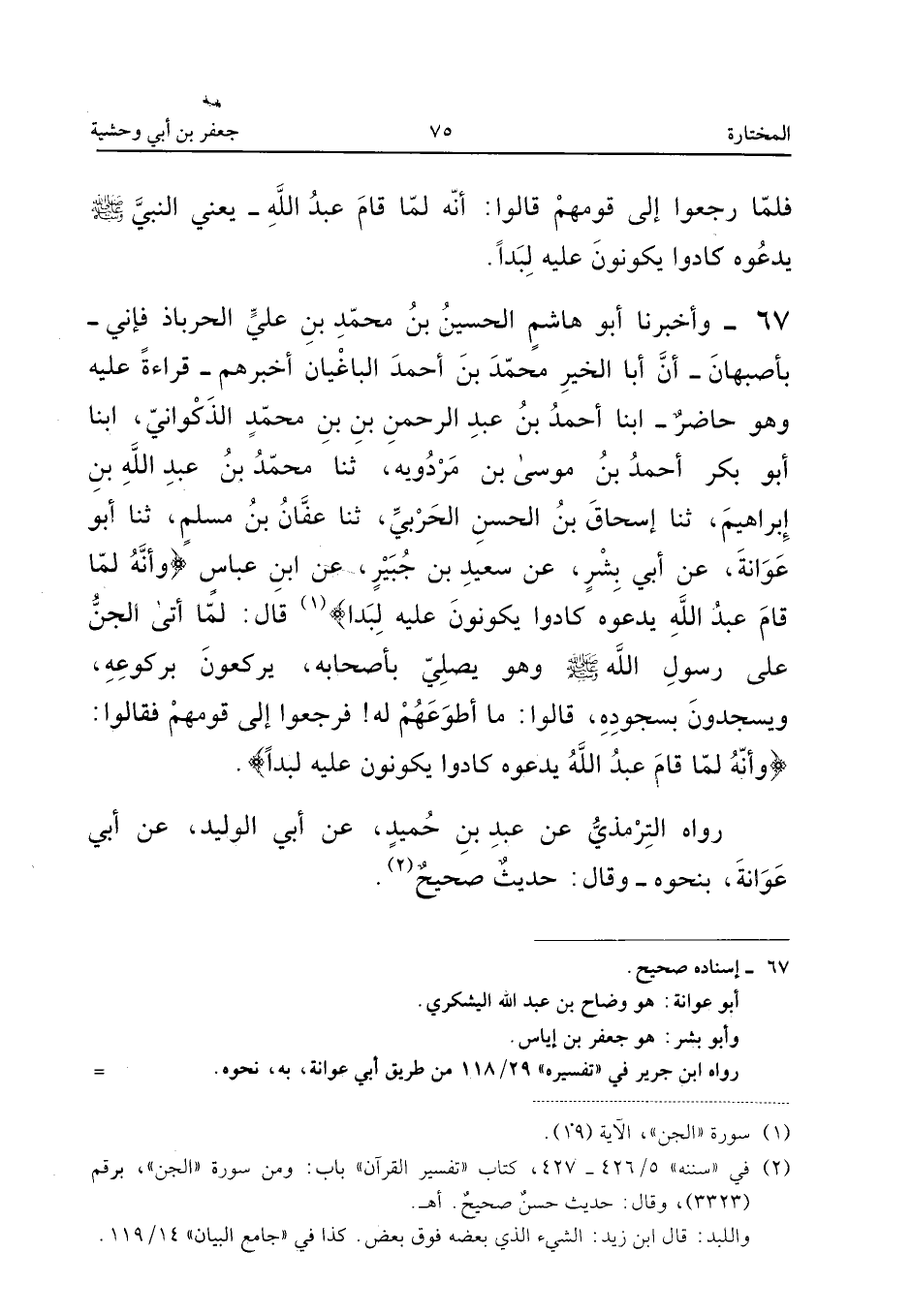 67 - وَأَخَبْرَنَا أَبُو هَاشم الْحُسَيْن بن مُحَمَّد بن عَليّ الحرباذ فَإِنِّي بِأَصْبَهَانَ أَنَّ أَبَا الْخَيْرِ مُحَمَّدَ بْنَ أَحْمَدَ الباغيان أَخْبَرَهُمْ قِرَاءَةً عَلَيْهِ وَهُوَ حَاضِرٌ أبنا أَحْمَدُ بن عبد الرَّحْمَن بن بْنِ مُحَمَّدٍ الذَّكْوَانِيُّ أبنا أَبُو بَكْرٍ أَحْمَدُ بْنُ مُوسَى بْنِ مَرْدَوَيْهِ ثَنَا مُحَمَّدُ بْنُ عَبْدِ اللَّهِ بْنِ إِبْرَاهِيمَ ثَنَا إِسْحَاقُ بْنُ الْحَسَنِ الْحَرْبِيُّ ثَنَا عَفَّانُ بْنُ مُسْلِمٍ ثَنَا أَبُو عَوَانَةَ عَنْ أَبِي بِشْرٍ عَنْ سَعِيدِ بْنِ جُبَيْرٍ عَنِ ابْنِ عَبَّاسٍ {وَأَنَّهُ لَمَّا قَامَ عَبْدُ اللَّهِ يَدْعُوهُ كَادُوا يَكُونُونَ عَلَيْهِ لبدا} قَالَ لَمَّا أَتَى الْجِنُّ عَلَى رَسُولِ اللَّهِ صَلَّى اللَّهُ عَلَيْهِ وَسَلَّمَ وَهُوَ يُصَلِّي بِأَصْحَابِهِ يَرْكَعُونَ بِرُكُوعِهِ ويسجدون بسجوده قَالُوا مَا أطوعهم لَهُ فَرَجَعُوا إِلَى قَومهمْ فَقَالُوا {وَأَنَّهُ لَمَّا قَامَ عَبْدُ اللَّهِ يَدْعُوهُ كَادُوا يَكُونُونَ عَلَيْهِ لبدا}