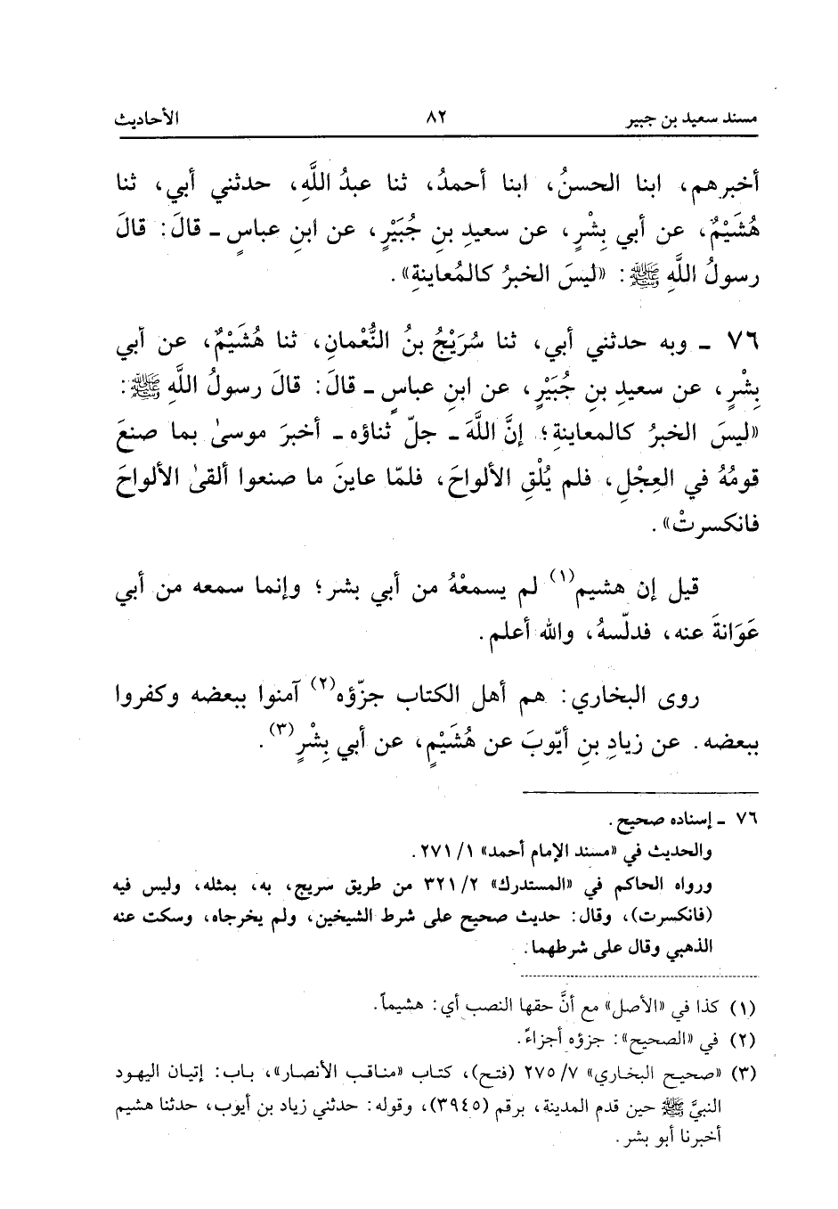 76 - وَبِهِ حَدَّثَنِي أَبِي ثَنَا سُرَيْجُ بْنُ النُّعْمَانِ ثَنَا هُشَيْمٌ عَنْ أَبِي بِشْرٍ عَنْ سَعِيدِ بْنِ جُبَيْرٍ عَنِ ابْنِ عَبَّاسٍ قَالَ قَالَ رَسُولُ اللَّهِ صَلَّى اللَّهُ عَلَيْهِ وَسَلَّمَ لَيْسَ الْخَبَرُ كَالْمُعَايَنَةِ إِنَّ اللَّهَ جَلَّ ثَنَاؤُهُ أَخْبَرَ مُوسَى بِمَا صَنَعَ قَوْمُهُ فِي الْعِجْلِ فَلَمْ يُلْقِ الأَلْوَاحَ فَلَمَّا عَايَنَ مَا صَنَعُوا أَلْقَى الأَلْوَاحَ فَانْكَسَرَتْ