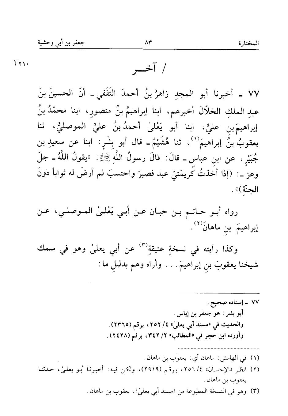 77 - أَخْبَرَنَا أَبُو الْمَجْدِ زَاهِرُ بْنُ أَحْمَدَ الثَّقَفِيُّ أَنَّ الْحُسَيْنَ بْنَ عَبْدِ الْمَلِكِ الْخَلَّالُ أَخْبَرَهُمْ أبنا إِبْرَاهِيمُ بْنُ مَنْصُورٍ أبنا مُحَمَّدُ بْنُ إِبْرَاهِيمَ بْنِ عَلِيٍّ أبنا أَبُو يَعْلَى أَحْمَدُ بْنُ عَلِيٍّ الْمَوْصِلِيُّ ثَنَا يَعْقُوبُ بْنُ إِبْرَاهِيمَ ثَنَا هُشَيْمٌ قَالَ أَبُو بِشْرٍ أبنا عَنْ سَعِيدِ بْنِ جُبَيْرٍ عَنِ ابْنِ عَبَّاسٍ قَالَ قَالَ رَسُولُ اللَّهِ صَلَّى اللَّهُ عَلَيْهِ وَسلم يَقُول الله جلّ وَعز (إِذَا أَخَذْتُ كَرِيمَتَيْ عَبْدٍ فَصَبَرَ وَاحْتَسَبَ لَمْ أَرْضَ لَهُ ثَوَابًا دُونَ الْجَنَّةِ)