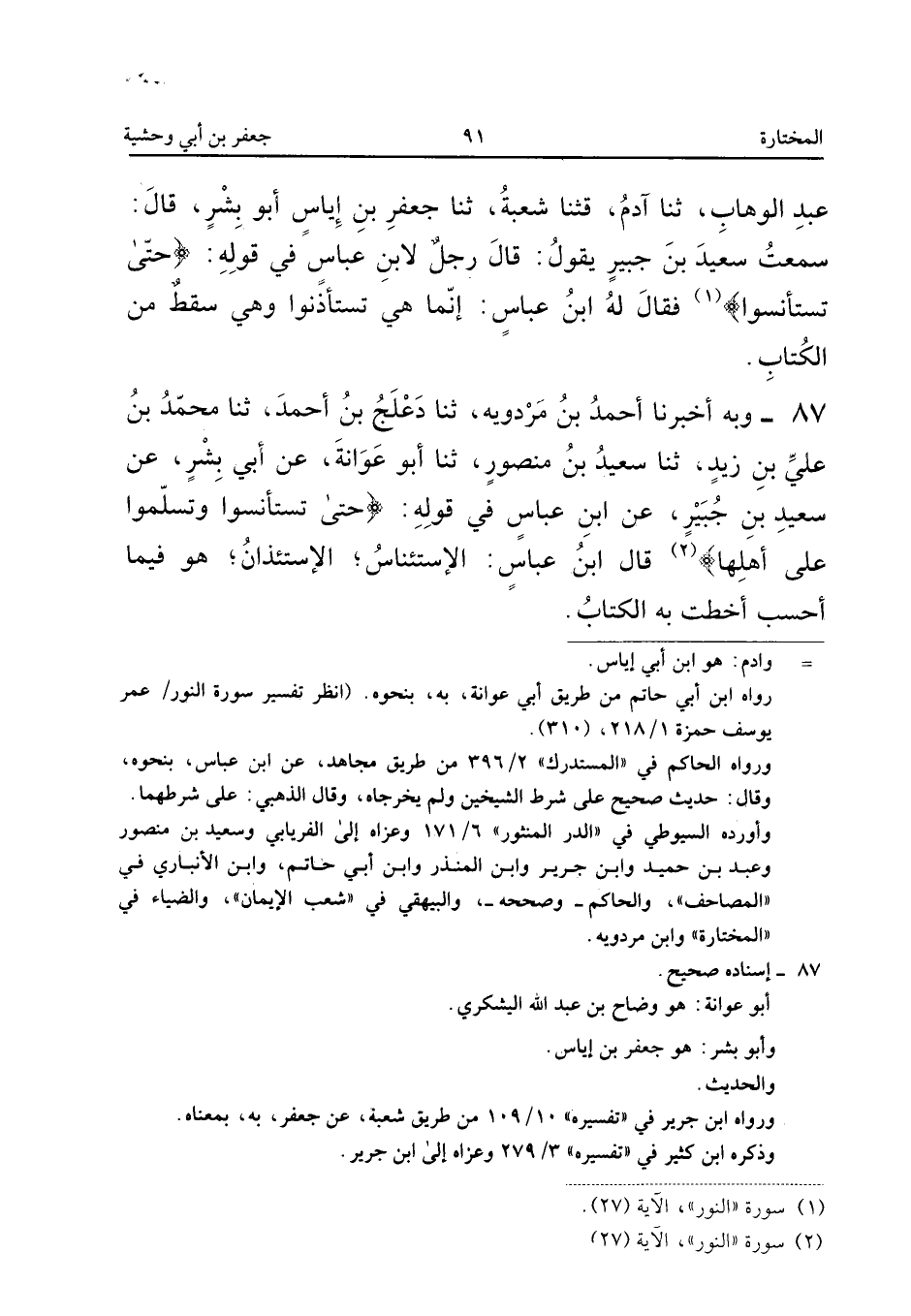 87 - وَبِهِ أَخْبَرَنَا أَحْمَدُ بْنُ مَرْدَوَيْهِ ثَنَا دَعْلَجُ بْنُ أَحْمَدَ ثَنَا مُحَمَّدُ بُنْ عَلِيِّ بْنِ زَيْدٍ ثَنَا سَعِيدُ بْنُ مَنْصُورٍ ثَنَا أَبُو عَوَانَةَ عَنْ أَبِي بِشْرٍ عَنْ سَعِيدِ بْنِ جُبَيْرٍ عَنِ ابْنِ عَبَّاسٍ فِي قَوْلِهِ {حَتَّى تستأنسوا وتسلموا على أَهلهَا} قَالَ ابْنُ عَبَّاسٍ الِاسْتِئْنَاس الاسْتِئْذَانُ هُوَ فِيمَا أَحسب أخطت بِهِ الْكتاب