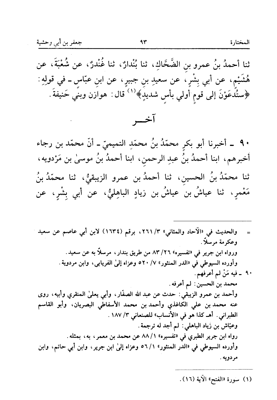 90 - أَخْبَرَنَا أَبُو بَكْرٍ مُحَمَّدُ بْنُ مُحَمَّدِ التَّمِيمِيُّ أَنَّ مُحَمَّدَ بْنَ رَجَاءٍ أَخْبَرَهُمْ أبنا أَحْمَدُ بْنُ عَبْدِ الرَّحْمَنِ أبنا أَحْمَدُ بْنُ مُوسَى بْنِ مَرْدَوَيْهِ ثَنَا مُحَمَّدُ بْنُ الْحُسَيْنِ ثَنَا أَحْمَدُ بْنُ عَمْرٍو الزِّيبَقِيُّ ثَنَا مُحَمَّدُ بْنُ مَعْمَرٍ ثَنَا عَيَّاشُ بْنُ عَيَّاشِ بْنِ زِيَادٍ الْبَاهِلِيُّ عَنْ أَبِي بِشْرٍ عَنْ سَعِيدِ بْنِ جُبَيْرٍ عَنِ ابْنِ عَبَّاسٍ فِي قَوْلِ اللَّهِ ألم وَحم وَنون قَالَ اسْمٌ مُنْقَطِعٌ