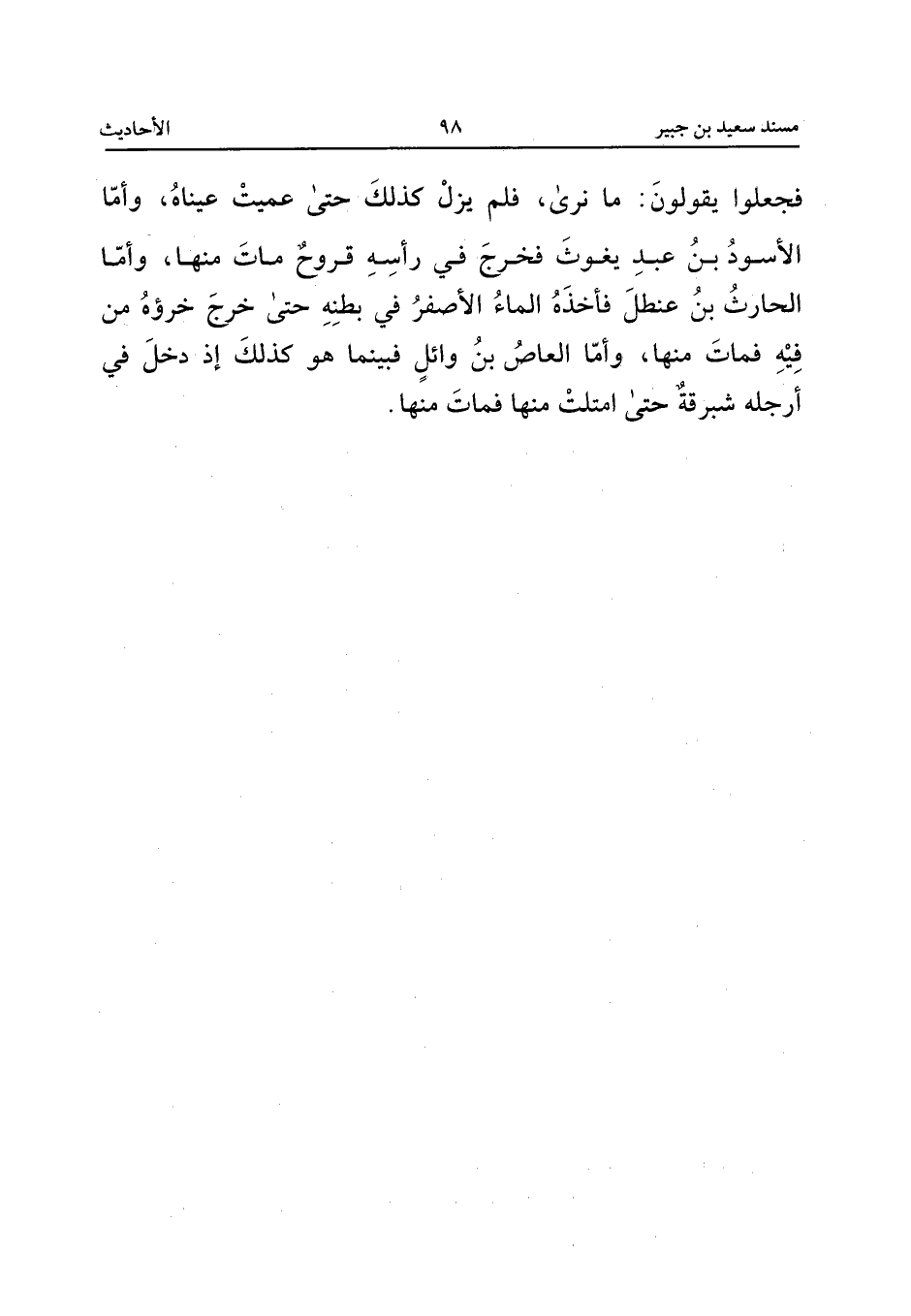 فَجَعَلُوا يَقُولُونَ مَا نَرَى فَلَمْ يَزَلْ كَذَلِكَ حَتَّى عَمِيَتْ عَيْنَاهُ وَأَمَّا الأَسْوَدُ بْنُ عَبْدِ يَغُوثَ فَخَرَجَ فِي رَأْسِهِ قُرُوحٌ مَاتَ مِنْهَا وَأَمَّا الْحَارِثُ بْنُ عَنْطَلٍ فَأَخَذَهُ الْمَاءُ الأَصْفَرُ فِي بَطْنِهِ حَتَّى خَرَجَ خُرْؤُهُ مِنْ فِيهِ فَمَاتَ مِنْهَا وَأَمَّا الْعَاصُ بْنُ وَائِلٍ فَبَيْنَمَا هُوَ كَذَلِكَ إِذْ دَخَلَ فِي أَرْجُلِهِ شِبْرِقَةٌ حَتَّى امْتَلَتْ مِنْهَا فَمَاتَ مِنْهَا