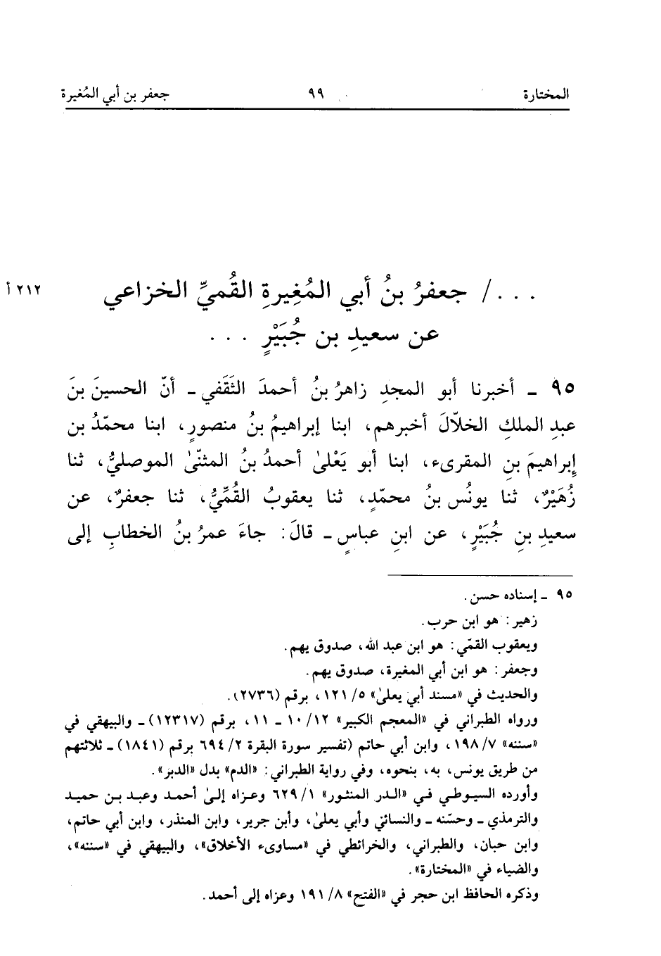 95 - أَخْبَرَنَا أَبُو الْمَجْدِ زَاهِرُ بْنُ أَحْمَدَ الثَّقَفِيُّ أَنَّ الْحُسَيْنَ بْنَ عَبْدِ الْمَلِكِ الْخَلالَ أَخْبَرَهُمْ أبنا إِبْرَاهِيمُ بْنُ مَنْصُورٍ ابْنا مُحَمَّد بن ابراهيم بن المقرىء أبنا أَبُو يَعْلَى أَحْمَدُ بْنُ الْمُثَنَّى الْمَوْصِلِيُّ ثَنَا زُهَيْرٌ ثَنَا يُونُسُ بْنُ مُحَمَّدٍ ثَنَا يَعْقُوبُ الْقُمِّيُّ ثَنَا جَعْفَرٌ عَنْ سَعِيدِ بْنِ جُبَيْرٍ عَنِ ابْنِ عَبَّاسٍ قَالَ جَاءَ عُمَرُ بن الْخطاب الى رَسُول الله ص
