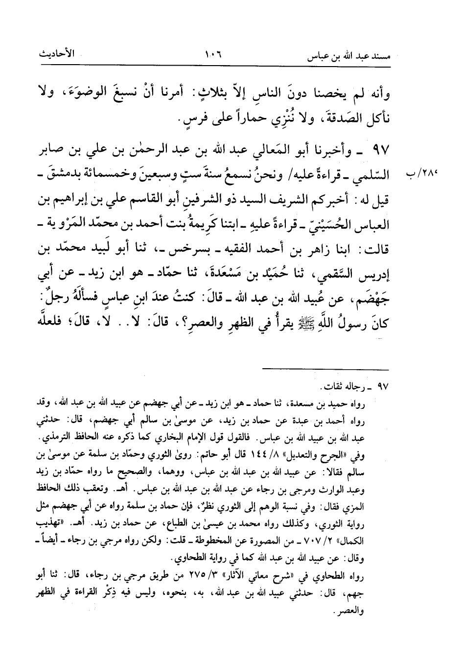 97 - وَأَخْبَرَنَا أَبُو الْمَعَالِي عَبْدُ اللَّهِ بْنُ عَبْدِ الرَّحْمَنِ بْنِ عَلِيِّ بْنِ صَابِرٍ السُّلَمِيُّ، قِرَاءَةً عَلَيْهِ، وَنَحْنُ نَسْمَعُ، سَنَةَ سِتٍّ وَسَبْعِينَ وَخَمْسِ مِائَةٍ بِدِمَشْقَ، قِيلَ لَهُ: أَخْبَرَكُمُ الشَّرِيفُ السَّيِّدُ ذُو الشَّرَفَيْنِ أَبُو الْقَاسِمِ عَلِيُّ بْنُ إِبْرَاهِيمَ بْنِ الْعَبَّاسِ الْحُسَيْنِيُّ، قِرَاءَةً عَلَيْهِ، أبتنا كَرِيمَةُ بِنْتُ أَحْمَدَ بْنِ مُحَمَّدٍ الْمَرْوِيَّةُ، قَالَتْ: أبنا زَاهِرُ بْنُ أَحْمَدَ الْفَقِيهُ، بِسَرْخَسَ، ثَنَا أَبُو لَبِيدٍ مُحَمَّدُ بْنُ إِدْرِيسَ السَّقَمِيُّ، ثَنَا حُمَيْدُ بْنُ مَسْعَدَةَ، ثَنَا حَمَّادٌ، هُوَ ابْنُ زَيْدٍ، عَنْ أَبِي جَهْضَمٍ، عَنْ عُبَيْدِ اللَّهِ بْنِ عَبْدِ اللَّهِ، قَالَ: كُنْتُ عِنْدَ ابْن عَبَّاس فَسَأَلَهُ رَجُلٌ: كَانَ رَسُولُ اللَّهِ صَلَّى اللَّهُ عَلَيْهِ وَسَلَّمَ يَقْرَأُ فِي الظُّهْرِ وَالْعَصْرِ؟ قَالَ: لَا. . لَا، قَالَ: فَلَعَلَّهُ
