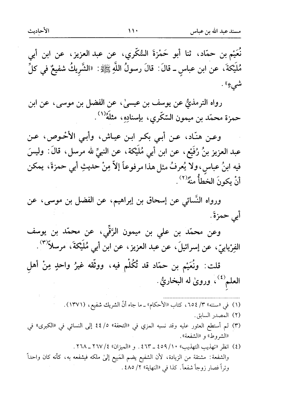 نُعَيْمُ بْنُ حَمَّادٍ، ثَنَا أَبُو حَمْزَةَ السُّكَّرِيُّ، عَنْ عَبْدِ الْعَزِيزِ، عَنِ ابْنِ أَبِي مُلَيْكَةَ، عَنِ ابْن عَبَّاس، قَالَ: قَالَ رَسُولُ اللَّهِ صَلَّى اللَّهُ عَلَيْهِ وَسَلَّمَ: «الشَّرِيكُ شَفِيعٌ فِي كُلِّ شَيْءٍ» .