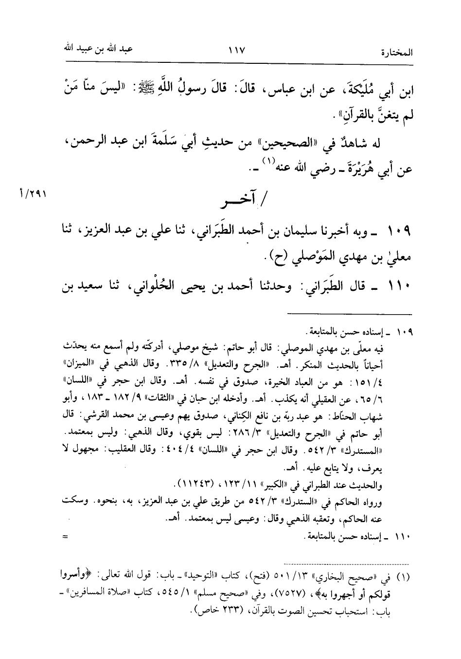 109 - وَبِهِ أَخْبَرَنَا سُلَيْمَانُ بْنُ أَحْمَدَ الطَّبَرَانِيُّ، ثَنَا عَلِيُّ بْنُ عَبْدِ الْعَزِيزِ، ثَنَا مُعَلَّى بْنُ مَهْدِيٍّ الْمَوْصِلِيُّ ح.