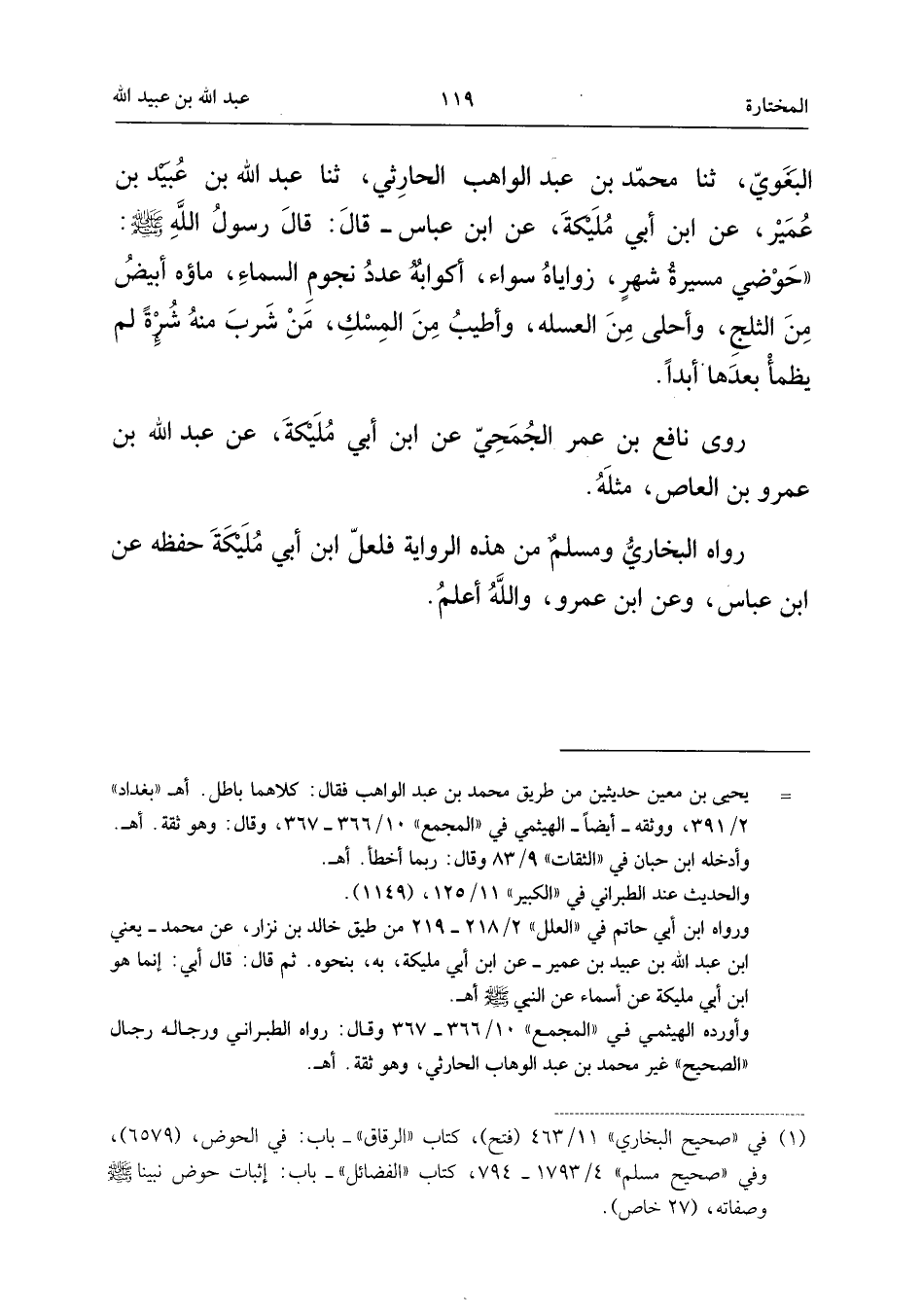 الْبَغَوِيُّ، ثَنَا مُحَمَّدُ بْنُ عَبْدِ الْوَهَّابِ الْحَارِثِيُّ، ثَنَا عَبْدُ اللَّهِ بْنُ عُبَيْدِ بْنِ عُمَيْرٍ، عَنِ ابْنِ أَبِي مُلَيْكَةَ، عَنِ ابْن عَبَّاس، قَالَ: قَالَ رَسُولُ اللَّهِ صَلَّى اللَّهُ عَلَيْهِ وَسَلَّمَ: «حَوْضِي مَسِيرَةُ شَهْرٍ، زَوَايَاهُ سَوَاءٌ، أَكْوَابُهُ عَدَدُ نُجُومِ السَّمَاءِ، مَاؤُهُ أَبْيَضُ مِنَ الثَّلْجِ، وَأَحْلَى مِنَ الْعَسَلِ، وَأَطْيَبُ مِنَ الْمِسْكِ، مَنْ شَرِبَ مِنْهُ شَرْبَةً لَمْ يَظْمَأْ بَعْدَهَا أَبَدًا» .