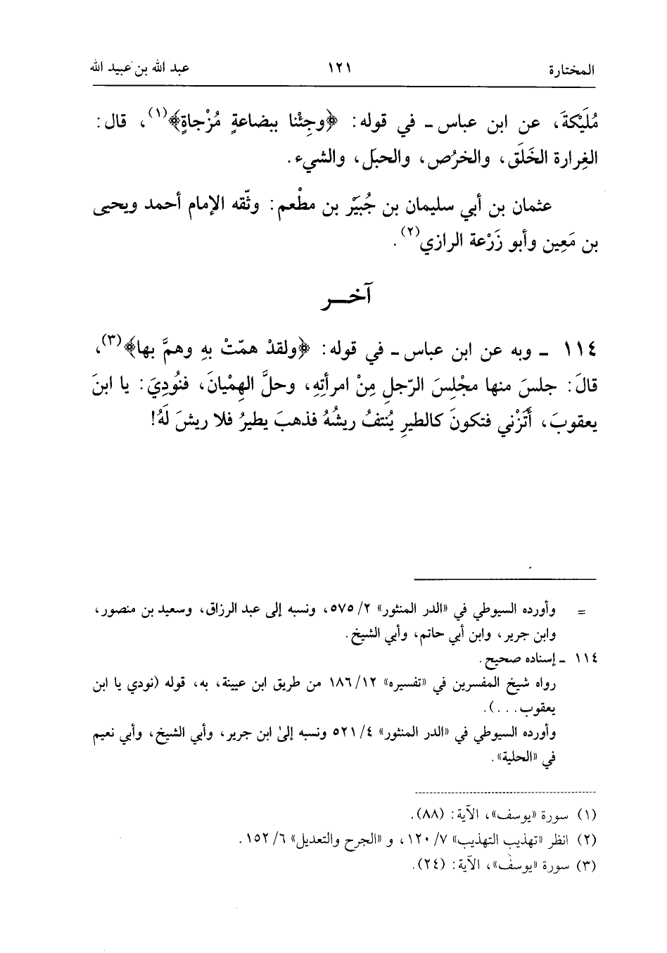 114 - وَبِهِ عَنِ ابْن عَبَّاس، فِي قَوْلِهِ: {وَلَقَدْ هَمَّتْ بِهِ وَهَمَّ بِهَا} [يُوسُف: 24] ، قَالَ: جَلَسَ مِنْهَا مَجْلِسَ الرَّجُلِ مِنَ امْرَأَتِهِ، وَحَلَّ الْهِمْيَانَ، فَنُودِيَ: يَابْنَ يَعْقُوبَ، أَتَزْنِيُ فَتَكُونَ كَالطَّيْرِ يُنْتَفُ رِيشُهُ فَذَهَبَ يَطِيرُ فَلا رِيشَ لَهُ!
