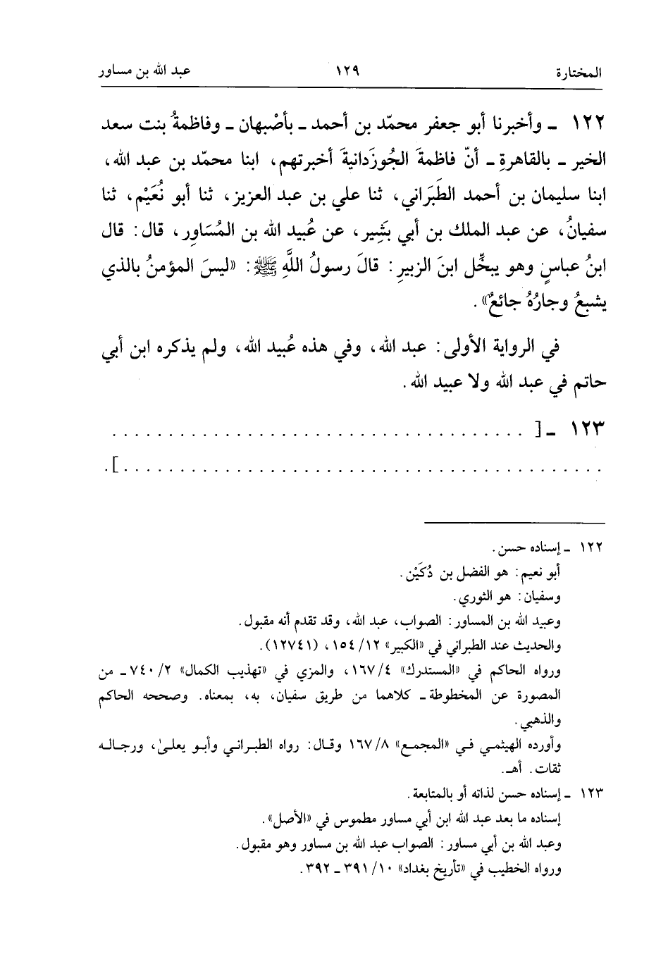 122 - وَأَخْبَرَنَا أَبُو جَعْفَرٍ مُحَمَّدُ بْنُ أَحْمَدَ، بِأَصْبَهَانَ، وَفَاطِمَةُ بِنْتُ سَعْدٍ الْخَيْرِ، بِالْقَاهِرَةِ، أَنَّ فَاطِمَةَ الْجُوزْدَانِيَّةَ أَخْبَرَتْهُمْ، أبنا مُحَمَّدُ بْنُ عَبْدِ اللَّهِ، أبنا سُلَيْمَانُ بْنُ أَحْمَدَ الطَّبَرَانِيُّ، ثَنَا عَلِيُّ بْنُ عَبْدِ الْعَزِيزِ، ثَنَا أَبُو نُعَيْمٍ، ثَنَا سُفْيَانُ، عَنْ عَبْدِ الْمَلِكِ بْنِ أَبِي بَشِيرٍ، عَنْ عُبَيْدِ اللَّهِ بْنِ الْمُسَاوِرِ، قَالَ: قَالَ ابْن عَبَّاس وَهُوَ يُبَخِّلُ ابْنَ الزُّبَيْرِ: قَالَ رَسُولُ اللَّهِ صَلَّى اللَّهُ عَلَيْهِ وَسَلَّمَ: «لَيْسَ الْمُؤْمِنُ بِالَّذِي يَشْبَعُ وَجَارُهُ جَائِعٌ» .