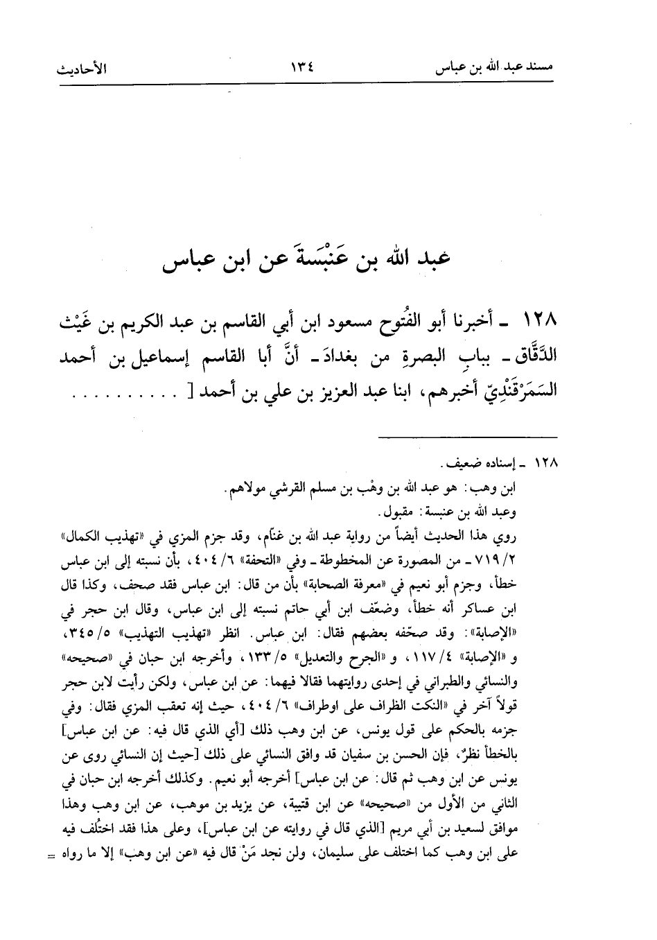 128 - أَخْبَرَنَا أَبُو الْفُتُوحِ مَسْعُودُ بْنُ أَبِي الْقَاسِمِ بْنِ عَبْدِ الْكَرِيمِ بْنِ غَيْثٍ الدَّقَّاقُ، بِبَابِ الْبَصْرَةِ مِنْ بَغْدَادَ، أَنَّ أَبَا الْقَاسِمِ إِسْمَاعِيلَ بْنَ أَحْمَدَ السَّمَرْقَنْدِيَّ أَخْبَرَهُمْ، أبنا عَبْدُ الْعَزِيزِ بْنُ عَلِيِّ بْنِ أَحْمَدَ. . . . . . .