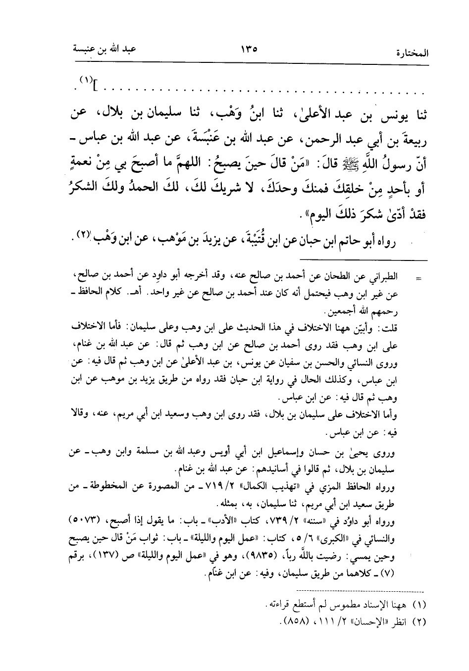 . . . . . . . . . . . . . . . . . ثَنَا يُونُسُ بْنُ عَبْدِ الأَعْلَى، ثَنَا ابْنُ وَهْبٍ، ثَنَا سُلَيْمَانُ بْنُ بِلالٍ، عَنْ رَبِيعَةَ بْنِ أَبِي عَبْدِ الرَّحْمَنِ، عَنْ عَبْدِ اللَّهِ بْنِ عَنْبَسَةَ، عَنْ ابْن عَبَّاس، أَنَّ رَسُولَ اللَّهِ صَلَّى اللَّهُ عَلَيْهِ وَسَلَّمَ، قَالَ: " مَنْ قَالَ حِينَ يُصْبِحُ: اللَّهُمَّ مَا أَصْبَحَ بِي مِنْ نِعْمَةٍ أَوْ بِأَحَدٍ مِنْ خَلْقِكَ فَمِنْكَ وَحْدَكَ، لَا شَرِيكَ لَكَ، لَكَ الْحَمْدُ، وَلَكَ الشُّكْرُ فَقَدْ أَدَّى شُكْرَ ذَلِكَ الْيَوْمِ ".