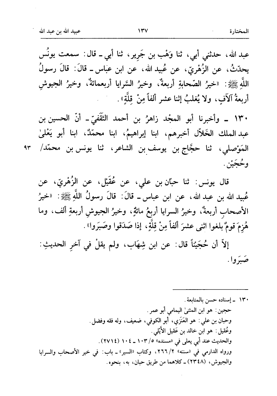 130 - وَأَخْبَرَنَا أَبُو الْمَجْدِ زَاهِرُ بْنُ أَحْمَدَ الثَّقَفِيُّ، أَنَّ الْحُسَيْنَ بْنَ عَبْدِ الْمَلِكِ الْخَلالَ أَخْبَرَهُمْ، أبنا إِبْرَاهِيمُ، أبنا مُحَمَّدٌ، أبنا أَبُو يَعْلَى الْمَوْصِلِيُّ، ثَنَا حَجَّاجُ بْنُ يُوسُفَ بْنِ الشَّاعِرِ، ثَنَا يُونُسُ بْنُ مُحَمَّدٍ، وَحُجَيْنٌ، قَالَ يُونُسُ: ثَنَا حِبَّانُ بْنُ عَلِيٍّ، عَنْ عَقِيلٍ، عَنِ الزُّهْرِيِّ، عَنْ عُبَيْدِ اللَّهِ بْنِ عَبْدِ اللَّهِ، عَنِ ابْن عَبَّاس، قَالَ: قَالَ رَسُولُ اللَّهِ صَلَّى اللَّهُ عَلَيْهِ وَسَلَّمَ: «خَيْرُ الأَصْحَابِ أَرْبَعَةٌ، وَخَيْرُ السَّرَايَا أَرْبَعُ مِائَةٍ، وَخَيْرُ الْجُيُوشِ أَرْبَعَةُ آلافٍ، وَمَا هُزِمَ قَوْمٌ بَلَغُوا اثْنَيْ عَشَرَ أَلْفًا مِنْ قِلَّةٍ، إِذَا صَدَقُوا وَصَبَرُوا» ، إِلا أَنَّ حُجَيْنًا قَالَ: عَنِ ابْنِ شِهَابٍ، وَلَمْ يَقُلْ فِي آخِرِ الْحَدِيثِ: صَبَرُوا