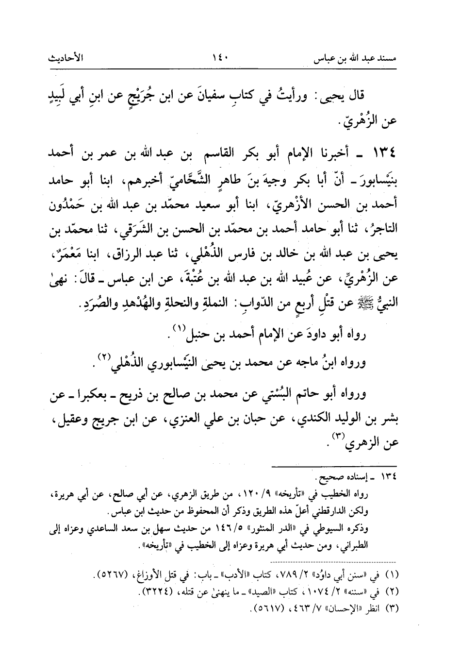 134 - أَخْبَرَنَا الإِمَامُ أَبُو بَكْرٍ الْقَاسِمُ بْنُ عَبْدِ اللَّهِ بْنِ عُمَرَ بْنِ أَحْمَدَ بِنَيْسَابُورَ، أَنَّ أَبَا بَكْرٍ وَجِيهَ بْنَ طَاهِرٍ الشَّحَّامِيَّ أَخْبَرَهُمْ، أبنا أَبُو حَامِدٍ أَحْمَدُ بْنُ الْحَسَنِ الأَزْهَرِيُّ، أبنا أَبُو سَعِيدٍ مُحَمَّدُ بْنُ عَبْدِ اللَّهِ بْنِ حَمْدُونٍ التَّاجِرُ، ثَنَا أَبُو حَامِدٍ أَحْمَدُ بْنُ مُحَمَّدِ بْنِ الْحَسَنِ ابْنِ الشَّرْقِيِّ، ثَنَا مُحَمَّدُ بْنُ يَحْيَى بْنِ عَبْدِ اللَّهِ بْنِ خَالِدِ بْنِ فَارِسٍ الذُّهْلِيُّ، ثَنَا عَبْدُ الرَّزَّاقِ، أبنا مَعْمَرٌ، عَنِ الزُّهْرِيِّ، عَنْ عُبَيْدِ اللَّهِ بْنِ عَبْدِ اللَّهِ بْنِ عُتْبَةَ، عَنِ ابْن عَبَّاس، قَالَ: نَهَى النَّبِيُّ صَلَّى اللَّهُ عَلَيْهِ وَسَلَّمَ عَنْ قَتْلِ أَرْبَعٍ مِنَ الدَّوَابِّ: النَّمْلَةِ، وَالنَّحْلَةِ، وَالْهُدْهُدِ، وَالصُّرَدِ، رَوَاهُ أَبُو دَاوُدَ عَنِ الإِمَامِ أَحْمَدَ بْنِ حَنْبَلٍ.
