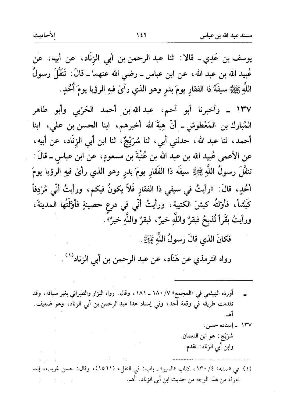 137 - وَأَخْبَرَنَا أَبُو أَحْمَدَ عَبْدُ اللَّهِ بْنُ أَحْمَدَ الْحَرْبِيُّ، وَأَبُو طَاهِرٍ الْمُبَارَكُ بْنُ الْمَعْطُوشِ، أَنَّ هِبَةَ اللَّهِ أَخْبَرَهُمْ، أبنا الْحَسَنُ بْنُ عَلِيٍّ، أبنا أَحْمَدُ، ثَنَا عَبْدُ اللَّهِ، حَدَّثَنِي أَبِي، ثَنَا سُرَيْجٌ، ثَنَا ابْنُ أَبِي الزِّنَادِ، عَنْ أَبِيهِ، عَنِ الأَعْمَى عُبَيْدِ اللَّهِ بْنِ عَبْدِ اللَّهِ بْنِ عُتْبَةَ بْنِ مَسْعُودٍ، عَنِ ابْن عَبَّاس، قَالَ: تَنَفَّلَ رَسُولُ اللَّهِ صَلَّى اللَّهُ عَلَيْهِ وَسَلَّمَ سَيْفَهُ ذَا الْفَقَارِ يَوْمَ بَدْرٍ، وَهُوَ الَّذِي رَأَى فِيهِ الرُّؤْيَا يَوْمَ أُحُدٍ، قَالَ: «رَأَيْتُ فِي سَيْفِي ذَا الْفَقَارِ فَلا يَكُونَ فِيكُمْ، وَرَأَيْتُ أَنِّي مُرْدِفًا كَبْشًا، فَأَوَّلْتُهُ كَبْشَ الْكَتِيبَةِ، وَرَأَيْتُ أَنِّي فِي دِرْعٍ حَصِينَةٍ فَأَوَّلْتُهَا الْمَدِينَةَ، وَرَأَيْتُ بَقَرًا تُذْبَحُ، فَبَقَرٌ وَاللَّهِ خَيْرٌ، فَبَقَرٌ وَاللَّهِ خَيْرٌ» ، فَكَانَ الَّذِي قَالَ رَسُولُ اللَّهِ صَلَّى اللَّهُ عَلَيْهِ وَسَلَّمَ.
