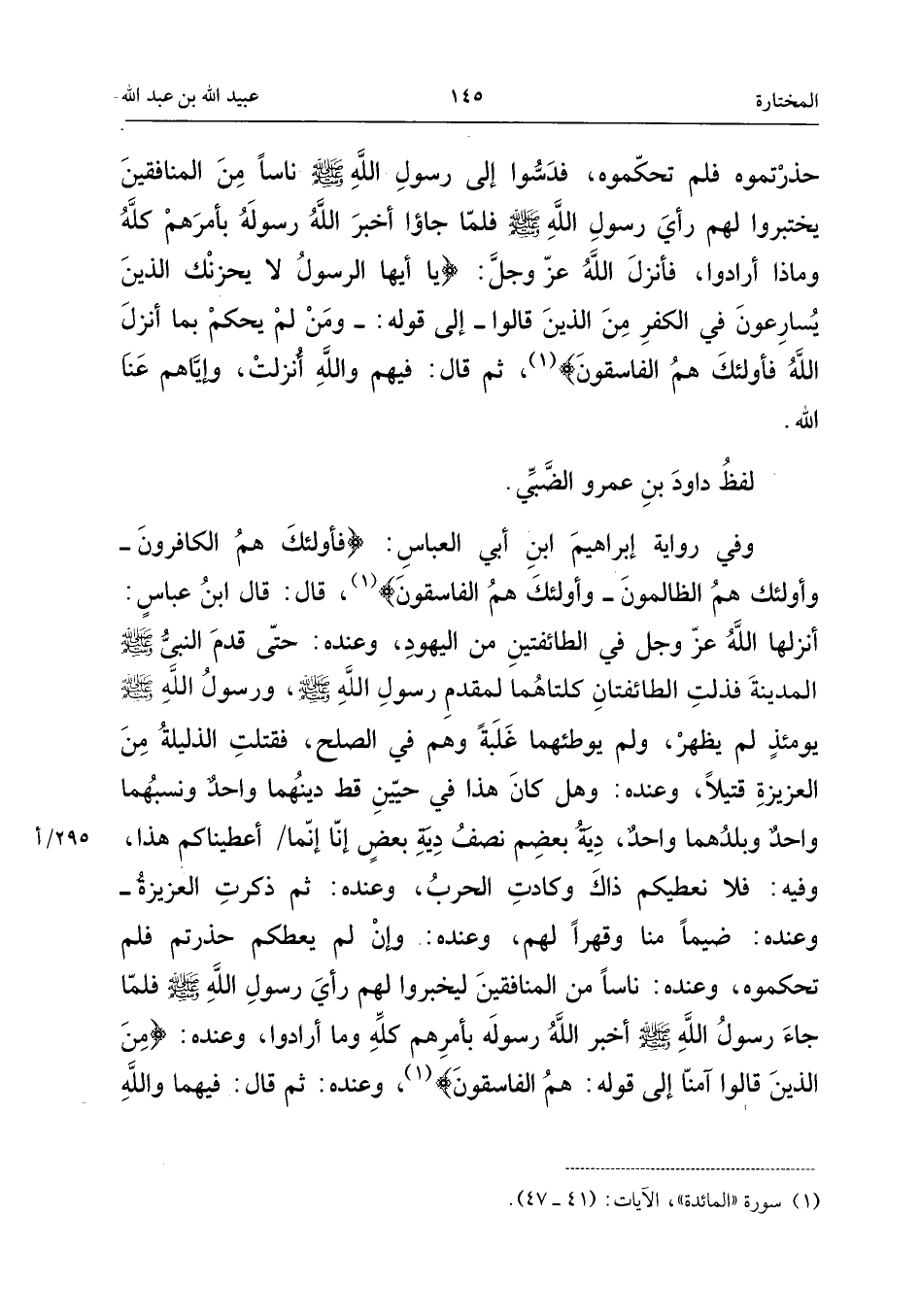 وَفِي رِوَايَةِ إِبْرَاهِيمَ بْنِ أَبِي الْعَبَّاسِ: {فَأُولَئِكَ هُمُ الْكَافِرُونَ} [الْمَائِدَة: 44] ، {فَأُولَئِكَ هُمُ الظَّالِمُونَ} [الْمَائِدَة: 45] {وَأُولَئِكَ هُمُ الْفَاسِقُونَ} [النُّور: 4] ، قَالَ: قَالَ ابْن عَبَّاس: أَنْزَلَهَا اللَّهُ عَزَّ وَجَلَّ فِي الطَّائِفَتَيْنِ مِنَ الْيَهُودِ، وَعِنْدَهُ: حَتَّى قَدِمَ النَّبِيُّ صَلَّى اللَّهُ عَلَيْهِ وَسَلَّمَ الْمَدِينَةَ، فَذَلَّتِ الطَّائِفَتَانِ كِلْتَاهُمَا لِمَقْدَمِ رَسُولِ اللَّهِ صَلَّى اللَّهُ عَلَيْهِ وَسَلَّمَ، وَرَسُولُ اللَّهِ صَلَّى اللَّهُ عَلَيْهِ وَسَلَّمَ يَوْمَئِذٍ لَمْ يَظْهَرْ، وَلَمْ يُوطِئْهُمَا غَلَبَةً، وَهُمْ فِي الصُّلْحِ، فَقَتَلَتِ الذَّلِيلَةُ مِنَ الْعَزِيزَةِ قَتِيلًا، وَعِنْدَهُ: وَهَلْ كَانَ هَذَا فِي حَيَّيْنِ قَطُّ دِينُهُمَا وَاحِدٌ وَنَسَبُهُمَا وَاحِدٌ وَبَلَدُهُمَا وَاحِدٌ، دِيَةُ بَعْضِهِمْ نِصْفُ دِيَةِ بَعْضٍ، إِنَّا إِنَّمَا أَعْطَيْنَاكُمْ هَذَا، وَفِيهِ: فَلا نُعْطِيكُمْ ذَاكَ وَكَادَتِ الْحَرْبُ، وَعِنْدَهُ: ثُمَّ ذَكَرَتِ الْعَزِيزَةُ، وَعِنْدَهُ: ضَيْمًا مِنَّا وَقَهْرًا لَهُمْ، وَعِنْدَهُ: وَإِنْ لَمْ يُعْطِكُمْ حَذِرْتُمْ فَلَمْ تُحَكِّمُوهُ، وَعِنْدَهُ: نَاسًا مِنَ الْمُنَافِقِينَ لِيَخْبُرُوا لَهُم رَأْيَ رَسُولِ اللَّهِ صَلَّى اللَّهُ عَلَيْهِ وَسَلَّمَ، فَلَمَّا جَاءَ رَسُولُ اللَّهِ صَلَّى اللَّهُ عَلَيْهِ وَسَلَّمَ أَخْبَرَ اللَّهُ رَسُولَهُ بِأَمْرِهِمْ كُلِّهِ وَمَا أَرَادُوا، وَعِنْدَهُ: {مِنَ الَّذِينَ قَالُوا آمَنَّا} [الْمَائِدَة: 41] إِلَى قَوْلِهِ: {هُمُ الْفَاسِقُونَ} [الْمَائِدَة: 47] ، وَعِنْدَهُ: ثُمَّ قَالَ: فِيهِمَا وَاللَّهِ