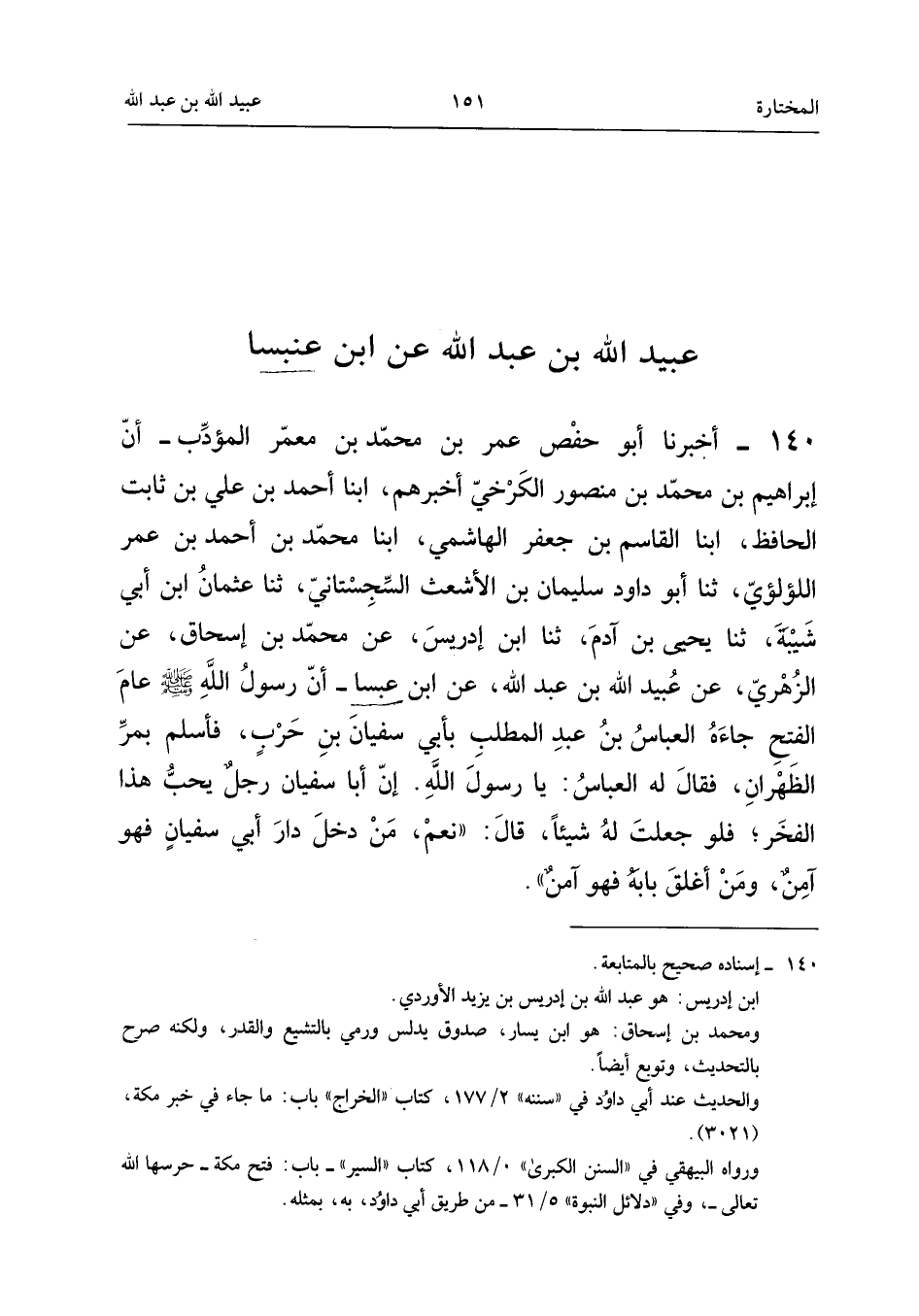 140 - أَخْبَرَنَا أَبُو حَفْصٍ عُمَرُ بْنُ مُحَمَّدِ بْنِ مَعْمَرٍ الْمُؤَدِّبُ، أَنَّ إِبْرَاهِيمَ بْنَ مُحَمَّدِ بْنِ مَنْصُورٍ الْكَرْخِيُّ أَخْبَرَهُمْ، أبنا أَحْمَدُ بْنُ عَلِيِّ بْنِ ثَابِتٍ الْحَافِظُ، أبنا الْقَاسِمُ بْنُ جَعْفَرٍ الْهَاشِمِيُّ، أبنا مُحَمَّدُ بْنُ أَحْمَدَ بْنِ عُمَرَ اللُّؤْلُئِيُّ، ثَنَا أَبُو دَاوُدَ سُلَيْمَانُ بْنُ الأَشْعَثِ السِّجِسْتَانِيُّ، ثَنَا عُثْمَانُ بْنُ أَبِي شَيْبَةَ، ثَنَا يَحْيَى بْنُ آدَمَ، ثَنَا ابْنُ إِدْرِيسَ، عَنْ مُحَمَّدِ بْنِ إِسْحَاقَ، عَنِ الزُّهْرِيِّ، عَنْ عُبَيْدِ اللَّهِ بْنِ عَبْدِ اللَّهِ، عَنِ ابْن عَبَّاس، أَنَّ رَسُولَ اللَّهِ صَلَّى اللَّهُ عَلَيْهِ وَسَلَّمَ عَامَ الْفَتْحِ جَاءَهُ الْعَبَّاسُ بْنُ عَبْدِ الْمُطَّلِبِ بِأَبِي سُفْيَانَ بْنِ حَرْبٍ، فَأَسْلَمَ بِمَرِّ الظَّهْرَانِ، فَقَالَ لَهُ الْعَبَّاسُ: يَا رَسُولَ اللَّهِ، إِنَّ أَبَا سُفْيَانَ رَجُلٌ يُحِبُّ هَذَا الْفَخْرَ، فَلَوْ جَعَلْتَ لَهُ شَيْئًا، قَالَ: «نَعَمْ، مَنْ دَخَلَ دَارَ أَبِي سُفْيَانَ فَهُوَ آمِنٌ، وَمَنْ أَغْلَقَ بَابَهُ فَهُوَ آمِنٌ»