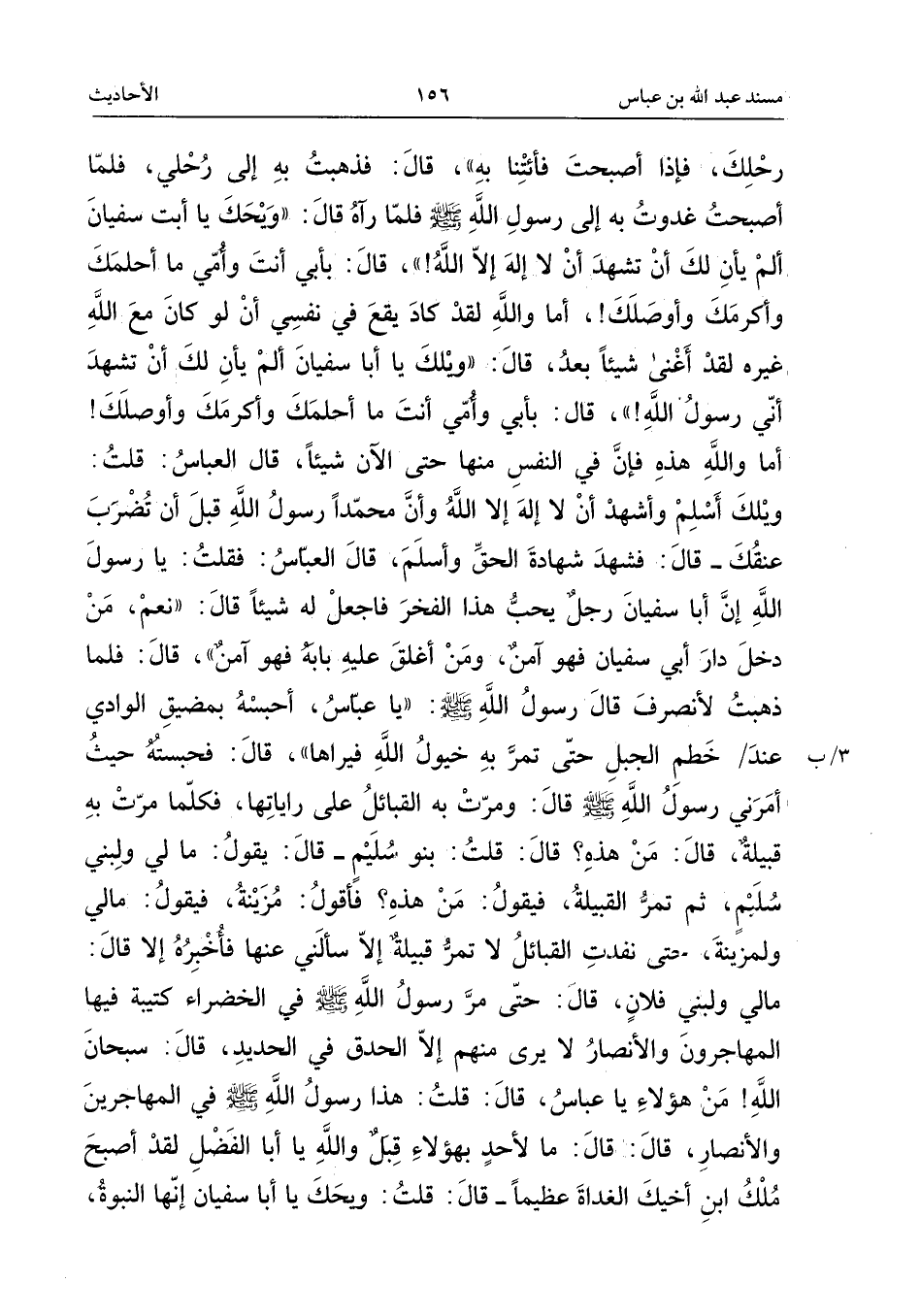 رَحْلِكَ، فَإِذَا أَصْبَحْتَ فَائْتِنَا بِهِ» ، قَالَ: فَذَهَبْتُ بِهِ إِلَى رَحْلِي، فَلَمَّا أَصْبَحْتُ، غَدَوْتُ بِهِ إِلَى رَسُولِ اللَّهِ صَلَّى اللَّهُ عَلَيْهِ وَسَلَّمَ، فَلَمَّا رَآهُ قَالَ: «وَيْحَكَ يَا أَبَا سُفْيَانَ، أَلَمْ يَأْنِ لَكَ أَنْ تَشْهَدَ أَنْ لَا إِلَهَ إِلا اللَّهُ» ، قَالَ: بِأَبِي أَنْتَ وَأُمِّي مَا أَحْلَمَكَ وَأَكْرَمَكَ وَأَوْصَلَكَ! ، أَمَّا وَاللَّهِ لَقَدْ كَادَ يَقَعُ فِي نَفْسِي أَنْ لَوْ كَانَ مَعَ اللَّهِ غَيْرُهُ لَقَدْ أَغْنَى شَيْئًا بَعْدُ، قَالَ: «وَيْلَكَ يَا أَبَا سُفْيَانَ أَلَمْ يَأْنِ لَكَ أَنْ تَشْهَدَ أَنِّي رَسُولُ اللَّهِ» ، قَالَ: بِأَبِي وَأُمِّي أَنْتَ مَا أَحْلَمَكَ وَأَكْرَمَكَ وَأَوْصَلَكَ! أَمَّا وَاللَّهِ هَذِهِ، فَإِنَّ فِي النَّفْسِ مِنْهَا حَتَّى الآنَ شَيْئًا، قَالَ الْعَبَّاسُ: قُلْتُ: وَيْلَكَ أَسْلِمْ وَاشْهَدْ أَنْ لَا إِلَهَ إِلا اللَّهُ وَأَنَّ مُحَمَّدًا رَسُولُ اللَّهِ قَبْلَ أَنْ تُضْرَبَ عُنُقُكَ، قَالَ: فَشَهِدَ شَهَادَةَ الْحَقِّ وَأَسْلَمَ، قَالَ الْعَبَّاسُ: فَقُلْتُ: يَا رَسُولَ اللَّهِ إِنَّ أَبَا سُفْيَانَ رَجُلٌ يُحِبُّ هَذَا الْفَخْرَ فَاجْعَلْ لَهُ شَيْئًا، قَالَ: «نَعَمْ، مَنْ دَخَلَ دَارَ أَبِي سُفْيَانَ فَهُوَ آمِنٌ، وَمَنْ أَغْلَقَ عَلَيْهِ بَابَهُ فَهُوَ آمِنٌ» ، قَالَ: فَلَمَّا ذَهَبْتُ لأَنْصَرِفَ قَالَ رَسُولُ اللَّهِ صَلَّى اللَّهُ عَلَيْهِ وَسَلَّمَ: «يَا عَبَّاسُ، احْبِسْهُ بِمَضِيقِ الْوَادِي عِنْدَ خَطْمِ الْجَبَلِ حَتَّى تَمُرَّ بِهِ خُيُولُ اللَّهِ فَيَرَاهَا» ، قَالَ: فَحَبَسْتُهُ حَيْثُ أَمَرَنِي رَسُولُ اللَّهِ صَلَّى اللَّهُ عَلَيْهِ وَسَلَّمَ قَالَ: وَمَرَّتْ بِهِ الْقَبَائِلُ عَلَى رَايَاتِهَا، فَكُلَّمَا مَرَّتْ بِهِ قَبِيلَةٌ، قَالَ: مَنْ هَذِهِ؟ قَالَ: قُلْتُ: بَنُو سُلَيْمٍ، قَالَ: يَقُولُ: مَا لِي وَلِبَنِي سُلَيْمٍ، ثُمَّ تَمُرُّ الْقَبِيلَةُ، فَيَقُولُ: مَنْ هَذِهِ؟ فَأَقُولُ: مُزَيْنَةُ، فَيَقُولُ: مَا لِي وَلِمُزَيْنَةَ، حَتَّى نَفَدَتِ الْقَبَائِلُ لَا تَمُرُّ قَبِيلَةٌ إِلا سَأَلَنِي عَنْهَا فَأُخْبِرُهُ إِلا قَالَ: مَا لِي وَلِبَنِي فُلانٍ، قَالَ: حَتَّى مَرَّ رَسُولُ اللَّهِ صَلَّى اللَّهُ عَلَيْهِ وَسَلَّمَ فِي الْخَضْرَاءِ، كَتِيبَةٌ فِيهَا الْمُهَاجِرُونَ وَالأَنْصَارُ لَا يُرَى مِنْهُمْ إِلا الْحَدَقَ فِي الْحَدِيدِ، قَالَ: سُبْحَانَ اللَّهِ! مَنْ هَؤُلاءِ يَا عَبَّاسُ، قَالَ: قُلْتُ: هَذَا رَسُولُ اللَّهِ صَلَّى اللَّهُ عَلَيْهِ وَسَلَّمَ فِي الْمُهَاجِرِينَ وَالأَنْصَارِ، قَالَ: قَالَ: مَا لأَحَدٍ بِهَؤُلاءِ قَبْلُ، وَاللَّهِ يَا أَبَا الْفَضْلِ لَقَدْ أَصْبَحَ مُلْكُ ابْنِ أَخِيكَ الْغَدَاةَ عَظِيمًا، قَالَ: قُلْتُ: وَيْحَكَ يَا أَبَا سُفْيَانَ إِنَّهَا النُّبُوَّةُ،