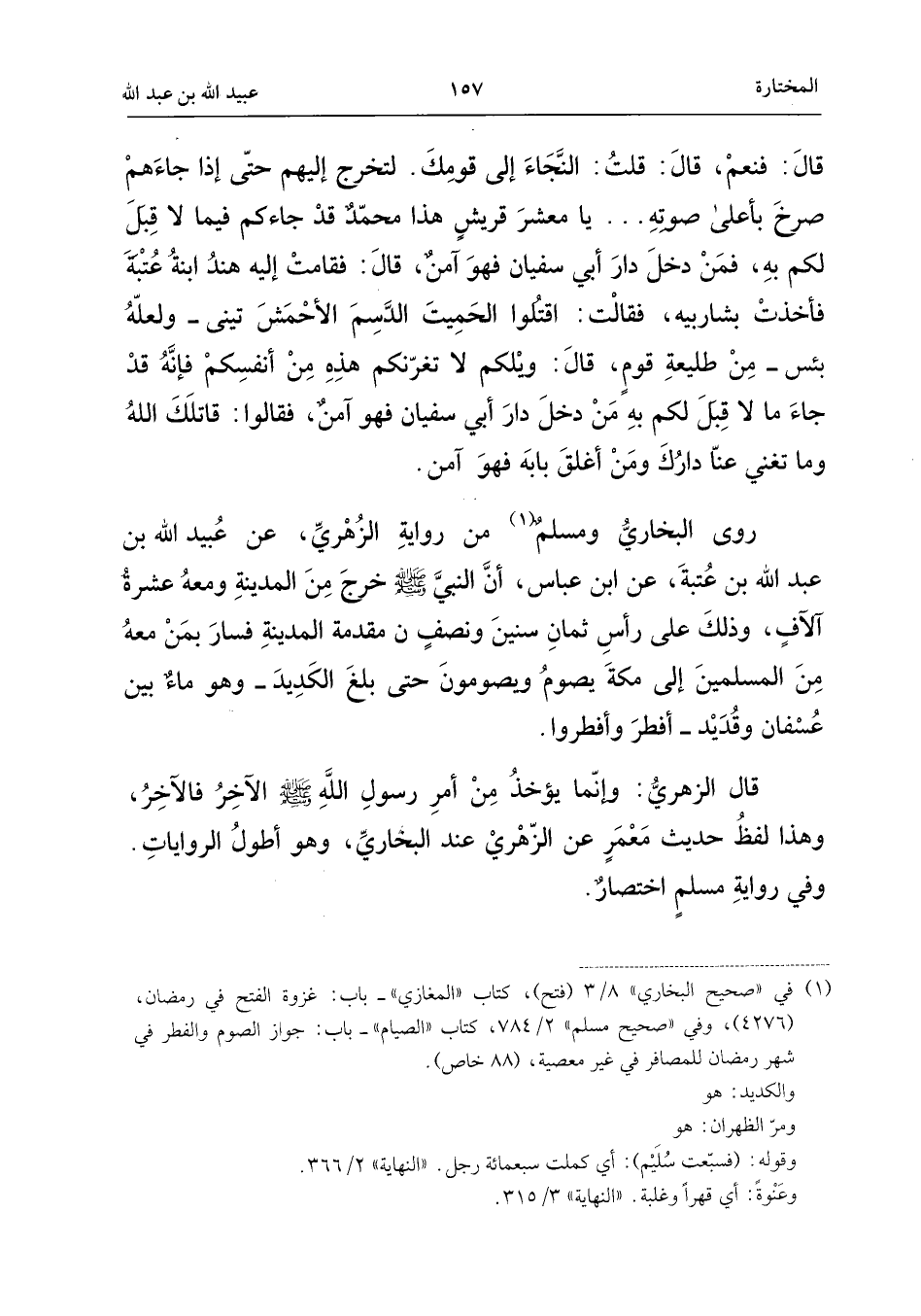رَوَى الْبُخَارِيُّ وَمُسْلِمٌ مِنْ رِوَايَةِ الزُّهْرِيِّ، عَنْ عُبَيْدِ اللَّهِ بْنِ عَبْدِ اللَّهِ بْنِ عُتْبَةَ، عَنِ ابْن عَبَّاس، أَنَّ النَّبِيَّ صَلَّى اللَّهُ عَلَيْهِ وَسَلَّمَ خَرَجَ مِنَ الْمَدِينَةِ وَمَعَهُ عَشَرَةُ آلافٍ، وَذَلِكَ عَلَى رَأْسِ ثَمَانِ سِنِينَ وَنِصْفٍ، مِنْ مُقَدِّمَةِ الْمَدِينَةِ، فَسَارَ بِمَنْ مَعَهُ مِنَ الْمُسْلِمِينَ إِلَى مَكَّةَ يَصُومُ وَيَصُومُونَ حَتَّى بَلَغَ الْكَدِيدَ، وَهُوَ مَاءٌ بَيْنَ عُسْفَانَ وَقُدَيْدٍ، أَفْطَرَ وَأَفْطَرُوا.