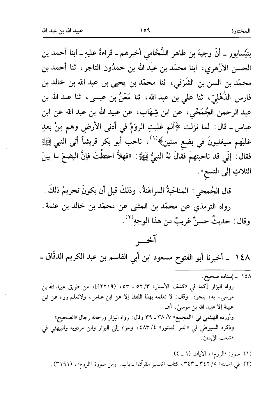 بِنَيْسَابُورَ، أَنَّ وَجِيهَ بْنَ طَاهِرٍ الشَّحَّامِيَّ أَخْبَرَهُمْ، قِرَاءَةً عَلَيْهِ، أبنا أَحْمَدُ بْنُ الْحَسَنِ الأَزْهَرِيُّ، أبنا مُحَمَّدُ بْنُ عَبْدِ اللَّهِ بْنِ حَمْدُونٍ التَّاجِرُ، ثَنَا أَحْمَدُ بْنُ مُحَمَّدِ بْنِ الْحَسَنِ بْنِ الشَّرْقِيِّ، ثَنَا مُحَمَّدُ بْنُ يَحْيَى بْنِ عَبْدِ اللَّهِ بْنِ خَالِدِ بْنِ فَارِسٍ الذُّهْلِيُّ، ثَنَا عَلِيُّ بْنُ عَبْدِ اللَّهِ، ثَنَا مَعْنُ بْنُ عِيسَى، ثَنَا عَبْدُ اللَّهِ بْنُ عَبْدِ الرَّحْمَنِ الْجُمَحِيُّ، عَنِ ابْنِ شِهَابٍ، عَنْ عُبَيْدِ اللَّهِ بْنِ عَبْدِ اللَّهِ، عَنِ ابْن عَبَّاس، قَالَ: لَمَّا نَزَلَتْ: {الم {1} غُلِبَتِ الرُّومُ {2} فِي أَدْنَى الأَرْضِ وَهُمْ مِنْ بَعْدِ غَلَبِهِمْ سَيَغْلِبُونَ {3} فِي بِضْعِ سِنِينَ} [الرّوم: 1-4] ، نَاحَبَ أَبُو بَكْرٍ قُرَيْشًا، وَأَتَى النَّبِيَّ صَلَّى اللَّهُ عَلَيْهِ وَسَلَّمَ فَقَالَ: إِنِّي قَدْ نَاحَبْتُهُمْ فَقَالَ لَهُ النَّبِيُّ صَلَّى اللَّهُ عَلَيْهِ وَسَلَّمَ: «فَهَلا احْتَطْتَ فَإِنَّ الْبِضْعَ مَا بَيْنَ الثَّلاثِ إِلَى التِّسْعِ» .