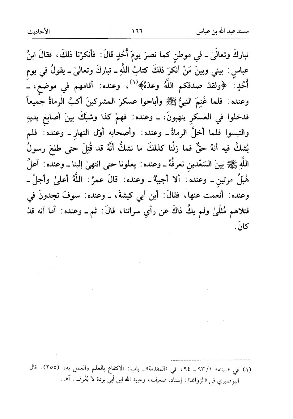 تَبَارَكَ وَتَعَالَى، فِي مَوْطِنٍ كَمَا نَصَرَ يَوْمَ أُحُدٍ، قَالَ: فَأَنْكَرْنَا ذَلِكَ، فَقَالَ ابْن عَبَّاس: بَيْنِي وَبَيْنَ مَنْ أَنْكَرَ ذَلِكَ كِتَابُ اللَّهِ، تَبَارَكَ وَتَعَالَى، يَقُولُ فِي يَوْمِ أُحُدٍ: {وَلَقَدْ صَدَقَكُمُ اللَّهُ وَعْدَهُ} [آل عمرَان: 152] ، وَعِنْدَهُ: أَقَامَهُمْ فِي مَوْضِعٍ، وَعِنْدَهُ: فَلَمَّا غَنِمَ النَّبِيُّ صَلَّى اللَّهُ عَلَيْهِ وَسَلَّمَ وَأَبَاحُوا عَسْكَرَ الْمُشْرِكِينَ أَكَبَّ الرُّمَاةُ جَمِيعًا، فَدَخَلُوا فِي الْعَسْكَرِ يَنْهَبُونَ، وَعِنْدَهُ: فَهُمْ كَذَا وَشَبَّكَ بَيْنَ أَصَابِعَ يَدَيْهِ وَالْتَبَسُوا، فَلَمَّا أَخَلَّ الرُّمَاةُ، وَعِنْدَهُ: وَأَصْحَابِهِ أَوَّلَ النَّهَارِ، وَعِنْدَهُ: فَلَمْ يُشَكَّ فِيهِ أَنَّهُ حَقٌّ فَمَا زِلْنَا كَذَلِكَ مَا نَشُكُّ أَنَّهُ قَدْ قُتِلَ حَتَّى طَلَعَ رَسُولُ اللَّهِ صَلَّى اللَّهُ عَلَيْهِ وَسَلَّمَ بَيْنَ السَّعْدَيْنِ نَعْرِفُهُ، وَعِنْدَهُ: يَعْلُونَا حَتَّى انْتَهَى إِلَيْنَا، وَعِنْدَهُ: اعْلُ هُبَلُ مَرَّتَيْنِ، وَعِنْدَهُ: أَلا أُجِيبُهُ، وَعِنْدَهُ: قَالَ عُمَرُ: اللَّهُ أَعْلَى وَأَجَلُّ، وَعِنْدَهُ: أَنْعَمَتْ عَنْهَا، فَقَالَ: أَيْنَ أَبِي كَبْشَةَ، وَعِنْدَهُ: سَوْفَ تَجِدُونَ فِي قَتْلاهُمْ مُثْلَى وَلَمْ يَكُ ذَاكَ عَنْ رَأْيِ سَرَاتِنَا، قَالَ: ثُمَّ، وَعِنْدَهُ: أَمَا أَنَّهُ قَدْ كَانَ
