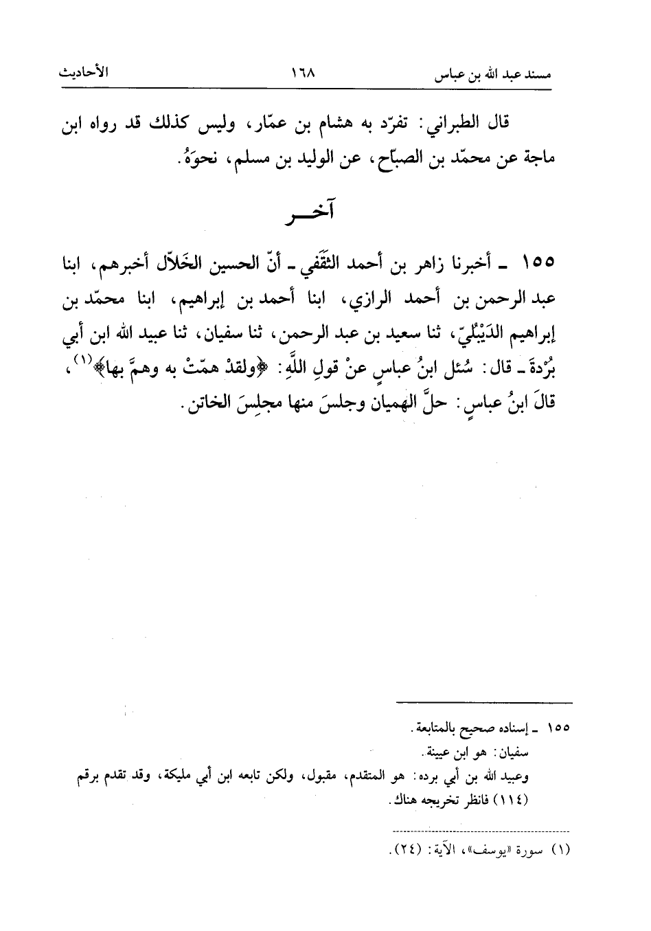 155 - أَخْبَرَنَا زَاهِرُ بْنُ أَحْمَدَ الثَّقَفِيُّ، أَنَّ الْحُسَيْنَ الْخَلالَ أَخْبَرَهُمْ، أبنا عَبْدُ الرَّحْمَنِ بْنُ أَحْمَدَ الرَّازِيُّ، أبنا أَحْمَدُ بْنُ إِبْرَاهِيمَ، أبنا مُحَمَّدُ بْنُ إِبْرَاهِيمَ الدَّيْبُلِيُّ، ثَنَا سَعِيدُ بْنُ عَبْدِ الرَّحْمَنِ، ثَنَا سُفْيَانُ، ثَنَا عُبَيْدُ اللَّهِ بْنُ أَبِي بُرْدَةَ، قَالَ: سُئِلَ ابْن عَبَّاس عَنْ قَوْلِ اللَّهِ: {وَلَقَدْ هَمَّتْ بِهِ وَهَمَّ بِهَا} [يُوسُف: 24] ، قَالَ ابْن عَبَّاس: حَلَّ الْهِمْيَانَ وَجَلَسَ مِنْهَا مَجْلِسَ الْخَاتِنِ