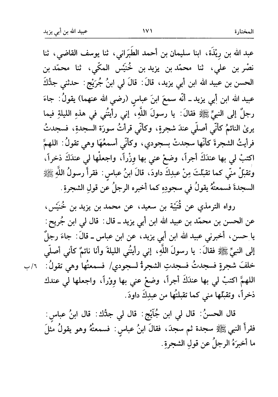 رَوَاهُ التِّرْمِذِيُّ عَنْ قُتَيْبَةَ بْنِ سَعِيدٍ، عَنْ مُحَمَّدِ بْنِ يَزِيدَ بْنِ خُنَيْسٍ، عَنِ الْحَسَنِ بْنِ مُحَمَّدِ بْنِ عُبَيْدِ اللَّهِ بْنِ أَبِي يَزِيدَ، قَالَ: قَالَ لِي ابْنُ جُرَيْجٍ: يَا حَسَنُ، أَخْبِرَنِي عُبَيْدُ اللَّهِ بْنُ أَبِي يَزِيدَ، عَنِ ابْن عَبَّاس، قَالَ: جَاءَ رَجُلٌ إِلَى النَّبِيِّ صَلَّى اللَّهُ عَلَيْهِ وَسَلَّمَ، فَقَالَ: يَا رَسُولَ اللَّهِ، إِنِّي رَأَيْتُنِي اللَّيْلَةَ وَأَنَا نَائِمٌ كَأَنِّي أُصَلِّي خَلْفَ شَجَرَةٍ فَسَجَدْتُ، فَسَجَدَتِ الشَّجَرَةُ لِسُجُودِي، فَسَمِعْتُهُا وَهِيَ تَقُولُ: اللَّهُمَّ اكْتُبْ لِي بِهَا عِنْدَكَ أَجْرًا، وَضَعْ عَنِّي بِهَا وِزْرًا، وَاجْعَلْهَا لِي عِنْدَكَ ذُخْرًا، وَتَقَبَّلْهَا مِنِّي كَمَا تَقَبَّلْتَهَا مِنْ عَبْدِكَ دَاوُدَ قَالَ الْحَسَنُ: قَالَ لِي ابْنُ جُرَيْجٍ: قَالَ لِي جَدُّكَ: قَالَ ابْن عَبَّاس: فَقَرَأَ النَّبِيُّ صَلَّى اللَّهُ عَلَيْهِ وَسَلَّمَ سَجْدَةً ثُمَّ سَجَدَ، فَقَالَ ابْن عَبَّاس: فَسَمِعْتُهُ وَهُوَ يَقُولُ مِثْلَ مَا أَخْبَرَهُ الرَّجُلُ عَنْ قَوْلِ الشَّجَرَةِ.