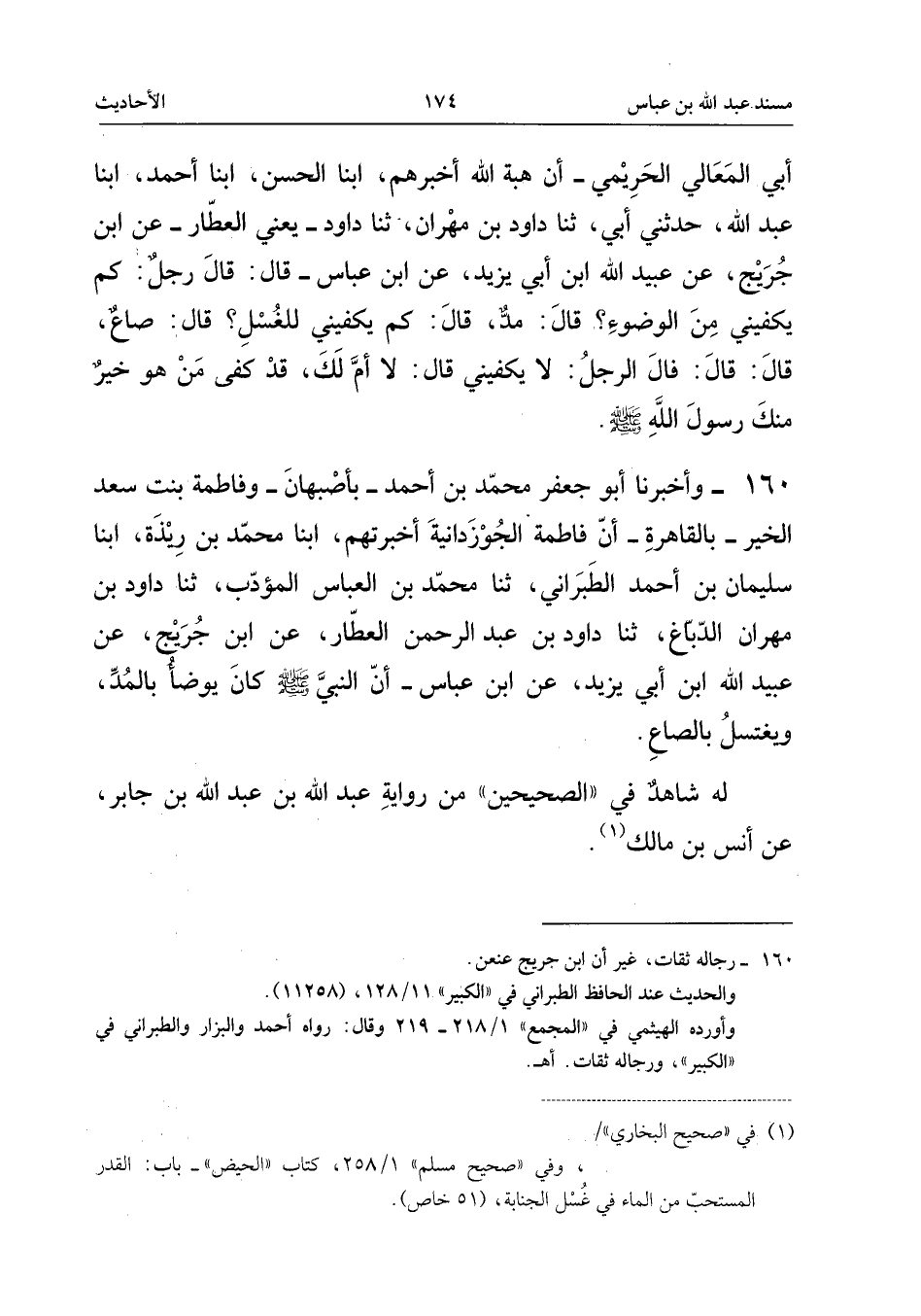 160 - وَأَخْبَرَنَا أَبُو جَعْفَرٍ مُحَمَّدُ بْنُ أَحْمَدَ، بِأَصْبَهَانَ، وَفَاطِمَةُ بِنْتُ سَعْدٍ الْخَيْرِ بِالْقَاهِرَةِ، أَنَّ فَاطِمَةَ الْجُوزْدَانِيَّةَ أَخْبَرَتْهُمْ، أبنا مُحَمَّدُ بْنُ رِيذَةَ، أبنا سُلَيْمَانُ بْنُ أَحْمَدَ الطَّبَرَانِيُّ، ثَنَا مُحَمَّدُ بْنُ الْعَبَّاسِ الْمُؤَدِّبُ، ثَنَا دَاوُدُ بْنُ مِهْرَانَ الدَّبَّاغُ، ثَنَا دَاوُدُ بْنُ عَبْدِ الرَّحْمَنِ الْعَطَّارُ، عَنِ ابْنِ جُرَيْجٍ، عَنْ عُبَيْدِ اللَّهِ بْنِ أَبِي يَزِيدَ، عَنِ ابْن عَبَّاس، أَنَّ النَّبِيَّ صَلَّى اللَّهُ عَلَيْهِ وَسَلَّمَ كَانَ يَتَوَضَّأُ بِالْمُدِّ، وَيَغْتَسِلُ بِالصَّاعِ.