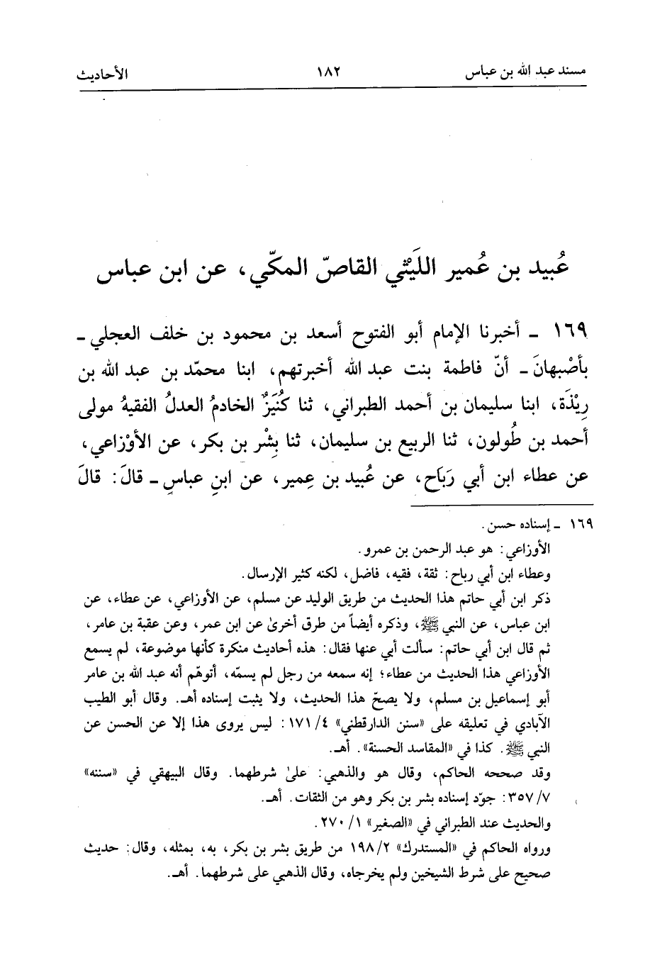 169 - أَخْبَرَنَا الإِمَامُ أَبُو الْفُتُوحِ أَسْعَدُ بْنُ مَحْمُودَ بْنِ خَلَفٍ الْعِجْلِيُّ، بِأَصْبَهَانَ، أَنَّ فَاطِمَةَ بِنْتَ عَبْدِ اللَّهِ أَخْبَرَتْهُمْ، أبنا مُحَمَّدُ بْنُ عَبْدِ اللَّهِ بْنِ رِيذَةَ، أبنا سُلَيْمَانُ بْنُ أَحْمَدَ الطَّبَرَانِيُّ، ثَنَا كُنَيْزٌ الْخَادِمُ الْعَدْلُ الْفَقِيهُ مَوْلَى أَحْمَدَ بْنِ طُولُونَ، ثَنَا الرَّبِيعُ بْنُ سُلَيْمَانَ، ثَنَا بِشْرُ بْنُ بَكْرٍ، عَنِ الأَوْزَاعِيِّ، عَنْ عَطَاءِ بْنِ أَبِي رَبَاحٍ، عَنْ عُبَيْدِ بْنِ عُمَيْرٍ، عَنِ ابْن عَبَّاس، قَالَ: قَالَ