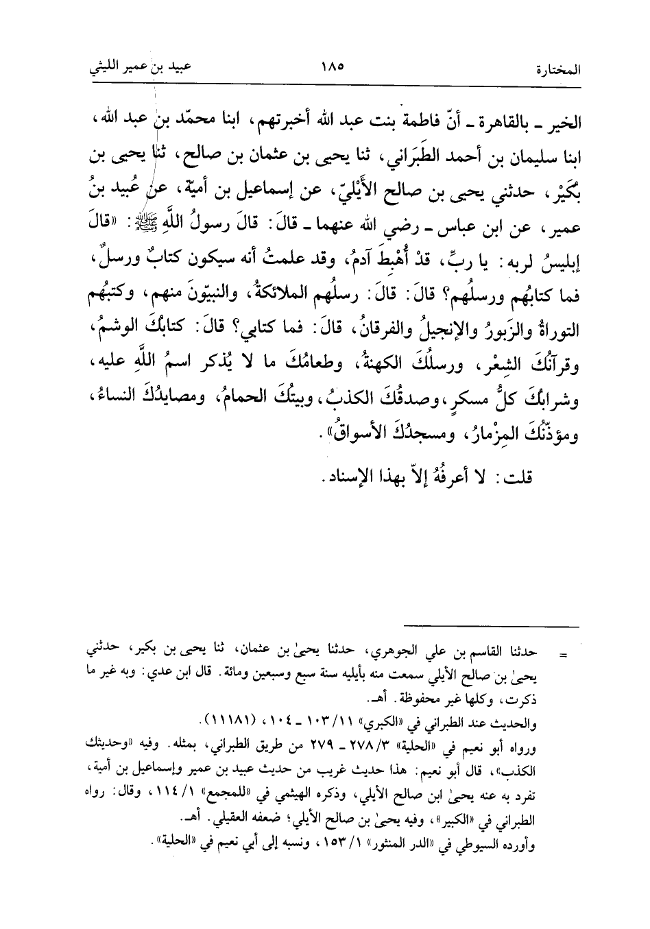 الْخَيْرِ بِالْقَاهِرَةِ، أَنَّ فَاطِمَةَ بِنْتَ عَبْدِ اللَّهِ أَخْبَرَتْهُمْ، أبنا مُحَمَّدُ بْنُ عَبْدِ اللَّهِ، أبنا سُلَيْمَانُ بْنُ أَحْمَدَ الطَّبَرَانِيُّ، ثَنَا يَحْيَى بْنُ عُثْمَانَ بْنِ صَالِحٍ، ثَنَا يَحْيَى بْنُ بُكَيْرٍ، حَدَّثَنِي يَحْيَى بْنُ صَالِحٍ الأَيْلِيُّ، عَنْ إِسْمَاعِيلَ بْنِ أُمَيَّةَ، عَنْ عُبَيْدِ بْنِ عُمَيْرٍ، عَنِ ابْن عَبَّاس، رَضِيَ اللَّهُ عَنْهُمَا، قَالَ: قَالَ رَسُولُ اللَّهِ صَلَّى اللَّهُ عَلَيْهِ وَسَلَّمَ: " قَالَ إِبْلِيسُ لِرَبِّهِ: يَا رَبِّ، قَدْ أُهْبِطَ آدَمُ، وَقَدْ عَلِمْتُ أَنَّهُ سَيَكُونُ كِتَابٌ وَرُسُلٌ، فَمَا كِتَابُهُمْ وَرُسُلُهُمْ، قَالَ: قَالَ: رُسُلُهُمُ الْمَلائِكَةُ، وَالنَّبِيُّونَ مِنْهُمْ، وَكُتُبُهُمُ التَّوْرَاةُ وَالزَّبُورُ وَالإِنْجِيلُ وَالْفُرْقَانُ، قَالَ: فَمَا كِتَابِي؟ قَالَ: كِتَابُكَ الْوَشْمُ، وَقُرْآنُكَ الشِّعْرُ، وَرُسُلُكَ الْكَهَنَةُ، وَطَعَامُكَ مَا لَا يُذْكَرُ اسْمُ اللَّهِ عَلَيْهِ، وَشَرَابُكَ كُلُّ مُسْكِرٍ، وَصِدْقُكَ الْكَذِبُ، وَبَيْتُكَ الْحَمَّامُ، وَمَصايِدُكَ النِّسَاءُ، وَمُؤَذِّنُكَ الْمِزْمَارُ، وَمَسْجِدُكَ الأَسْوَاقُ ".