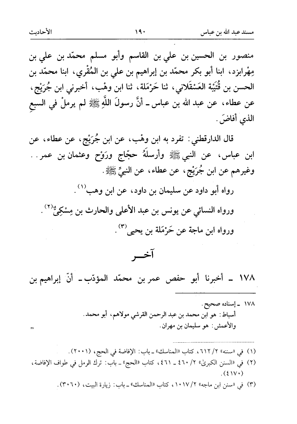 مَنْصُورُ بْنُ الْحُسَيْنِ بْنِ عَلِيِّ بْنِ الْقَاسِمِ،، وَأَبُو مُسْلِمٍ مُحَمَّدُ بْنُ عَلِيِّ بْنِ مِهْرَابزدَ، أبنا أَبُو بَكْرٍ مُحَمَّدُ بْنُ إِبْرَاهِيمَ بْنِ عَلِيِّ ابْنِ الْمُقْرِئِ، أبنا مُحَمَّدُ بْنُ الْحَسَنِ بْنِ قُتَيْبَةَ الْعَسْقَلانِيُّ، ثَنَا حَرْمَلَةُ، ثَنَا ابْنُ وَهْبٍ، أَخْبَرَنِي ابْنُ جُرَيْجٍ، عَنْ عَطَاءٍ، عَنْ ابْن عَبَّاس، أَنَّ رَسُولَ اللَّهِ صَلَّى اللَّهُ عَلَيْهِ وَسَلَّمَ لَمْ يَرْمُلْ فِي السَّبْعِ الَّذِي أَفَاضَ.