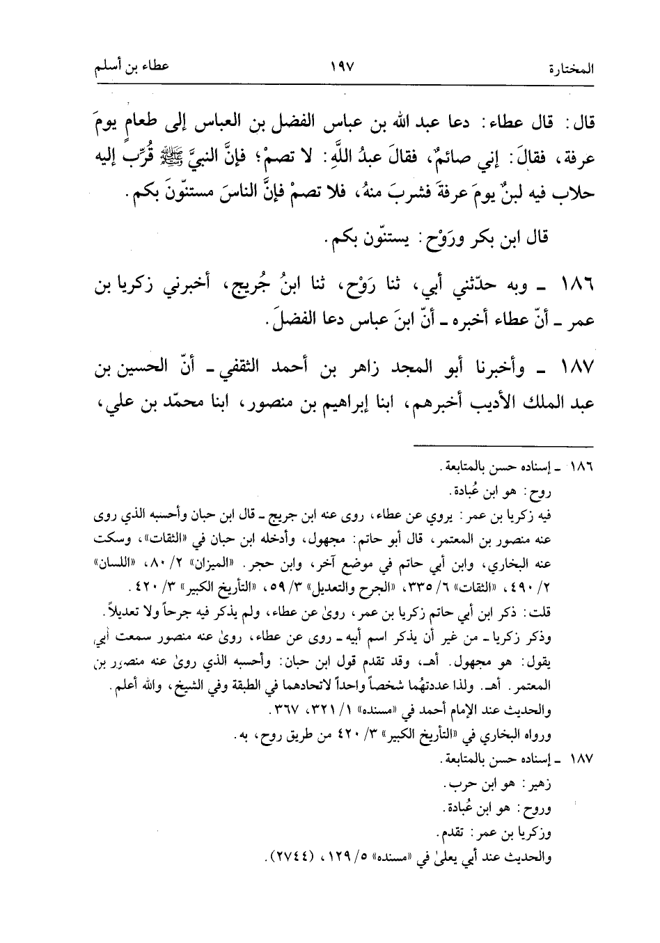 186 - وَبِهِ حَدَّثَنِي أَبِي، ثَنَا رَوْحٌ، ثَنَا ابْنُ جُرَيْجٍ، أَخْبَرَنِي زَكَرِيَّا بْنُ عُمَرَ، أَنَّ عَطَاءَ أَخْبَرَهُ، أَنَّ ابْن عَبَّاس دَعَا الْفَضْلَ
