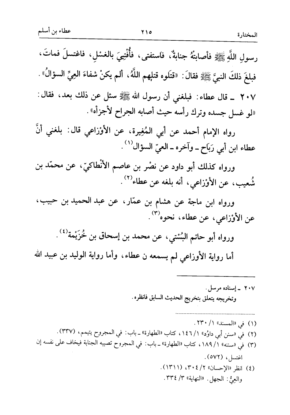 207 - قَالَ عَطَاءٌ: فَبَلَغَنِي أَنَّ رَسُولَ اللَّهِ صَلَّى اللَّهُ عَلَيْهِ وَسَلَّمَ سُئِلَ عَنْ ذَلِكَ بَعْدُ، فَقَالَ: «لَوْ غَسَلَ جَسَدَهُ وَتَرَكَ رَأْسَهُ حَيْثُ أَصَابَهُ الْجِرَاحُ لأَجْزَأَهُ» .