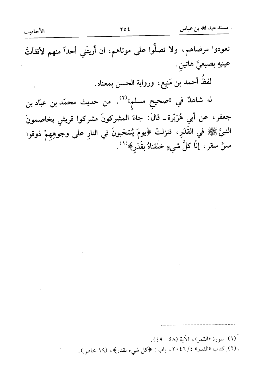 لَهُ شَاهِدٌ فِي صَحِيحِ مُسْلِمٍ مِنْ حَدِيثِ مُحَمَّدِ بْنِ عَبَّادِ بْنِ جَعْفَرٍ، عَنْ أَبِي هُرَيْرَةَ، قَالَ: جَاءَ الْمُشْرِكُونَ مُشْرِكُو قُرَيْشٍ يُخَاصِمُونَ النَّبِيَّ صَلَّى اللَّهُ عَلَيْهِ وَسَلَّمَ فِي الْقَدَرِ، فَنَزَلَتْ {يَوْمَ يُسْحَبُونَ فِي النَّارِ عَلَى وُجُوهِهِمْ ذُوقُوا مَسَّ سَقَرَ {48} إِنَّا كُلَّ شَيْءٍ خَلَقْنَاهُ بِقَدَرٍ {49} } [الْقَمَر: 48-49]