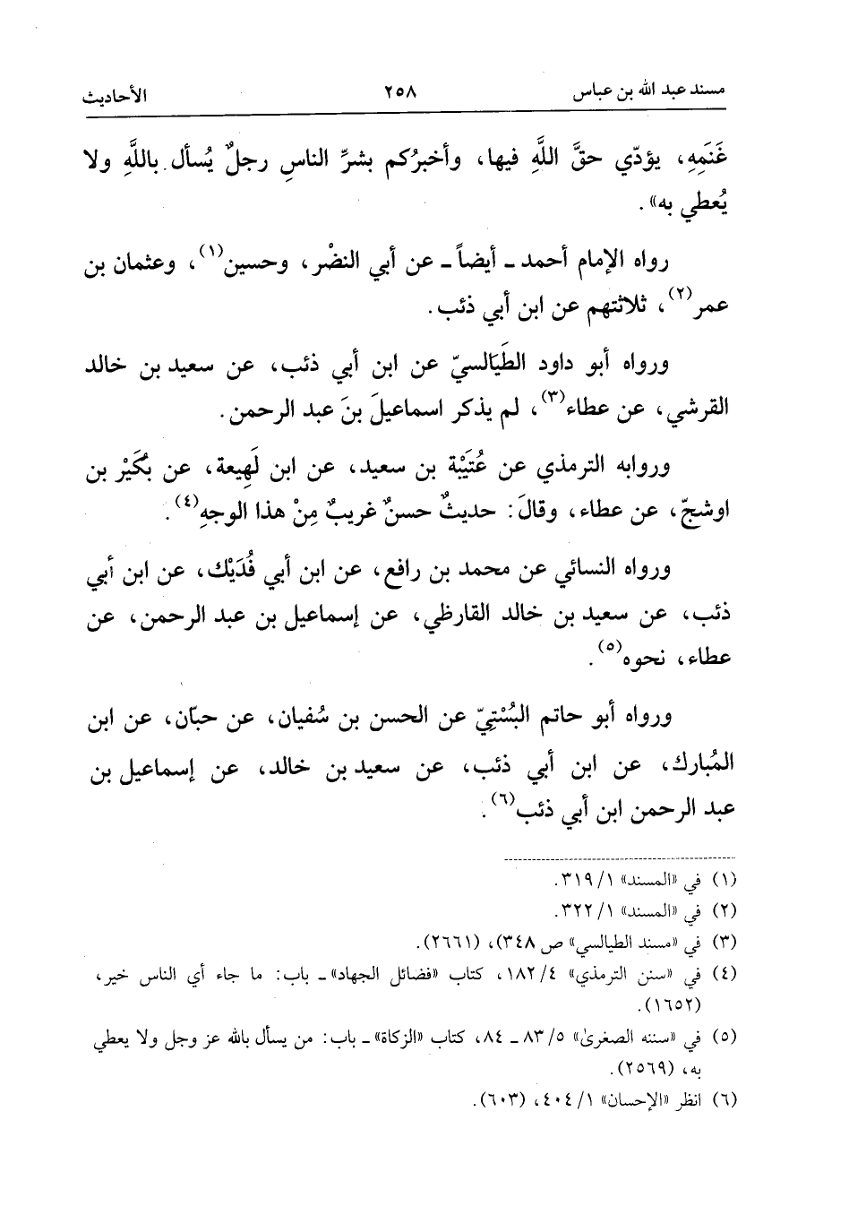 رَوَاهُ الإِمَامُ أَحْمَدُ، أَيْضًا، عَنْ أَبِي النَّضْرِ، وَحُسَيْنٍ، وَعُثْمَانَ بْنِ عُمَرَ، ثَلاثَتُهُمْ عَنِ ابْنِ أَبِي ذِئْبٍ.