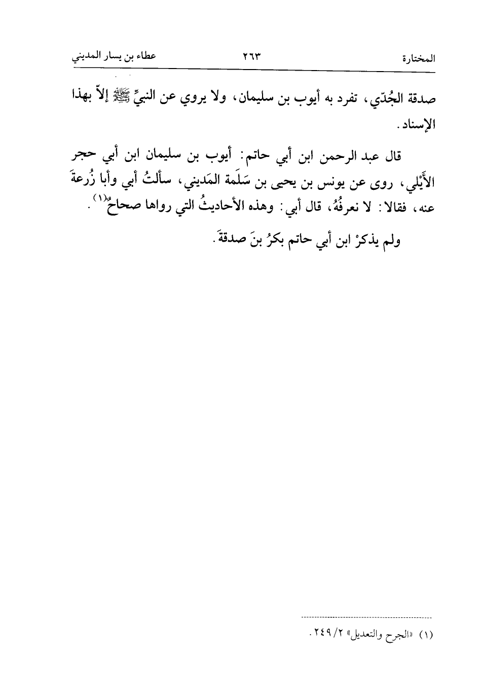 صَدَقَةَ الْجُدِّيُّ، تَفَرَّدَ بِهِ أَيُّوبُ بْنُ سُلَيْمَانَ، وَلا يُرْوَى عَنِ النَّبِيِّ صَلَّى اللَّهُ عَلَيْهِ وَسَلَّمَ إِلا بِهَذَا الإِسْنَادِ.