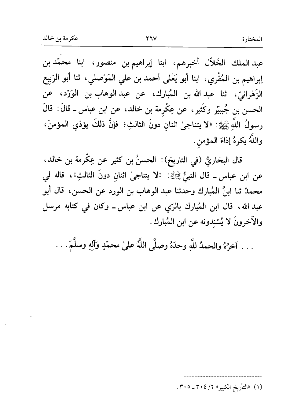 عَبْدِ الْمَلِكِ الْخَلالَ أَخْبَرَهُمْ، أبنا إِبْرَاهِيمُ بْنُ مَنْصُورٍ، أبنا مُحَمَّدُ بْنُ إِبْرَاهِيمَ ابْنِ الْمُقْرِئِ، أبنا أَبُو يَعْلَى أَحْمَدُ بْنُ عَلِيٍّ الْمَوْصِلِيُّ، ثَنَا أَبُو الرَّبِيعِ الزَّهْرَانِيُّ، ثَنَا عَبْدُ اللَّهِ بْنُ الْمُبَارَكِ، عَنْ عَبْدِ الْوَهَّابِ بْنِ الْوَرْدِ، عَنِ الْحَسَنِ بْنِ جُبَيْرٍ، وَكَثِيرٍ، عَنْ عِكْرِمَةَ بْنِ خَالِدٍ، عَنِ ابْن عَبَّاس، قَالَ: قَالَ رَسُولُ اللَّهِ صَلَّى اللَّهُ عَلَيْهِ وَسَلَّمَ: «لَا يَتَنَاجَى اثْنَانِ دُونَ الثَّالِثِ، فَإِنَّ ذَلِكَ يُؤْذِي الْمُؤْمِنَ، وَاللَّهُ يَكْرَهُ إِيذَاءَ الْمُؤْمِنِ» .