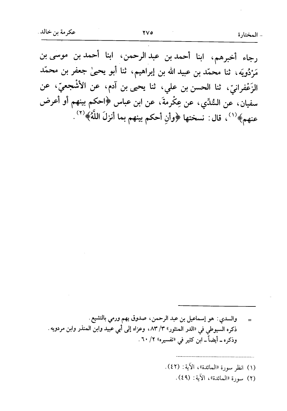 رَجَاءٍ أَخْبَرَهُمْ، أبنا أَحْمَدُ بْنُ عَبْدِ الرَّحْمَنِ، أبنا أَحْمَدُ بْنُ مُوسَى بْنِ مَرْدُوَيْهِ، ثَنَا مُحَمَّدُ بْنُ عُبَيْدِ اللَّهِ بْنِ إِبْرَاهِيمَ، ثَنَا أَبُو يَحْيَى جَعْفَرُ بْنُ مُحَمَّدٍ الزَّعْفَرَانِيُّ، ثَنَا الْحَسَنُ بْنُ عَلِيٍّ، ثَنَا يَحْيَى بْنُ آدَمَ، عَنِ الأَشْجَعِيِّ، عَنْ سُفْيَانَ، عَنِ السُّدِّيِّ، عَنْ عِكْرِمَةَ، عَنِ ابْن عَبَّاس: {فَاحْكُمْ بَيْنَهُمْ أَوْ أَعْرِضْ عَنْهُمْ} [الْمَائِدَة: 42] ، قَالَ: نَسَخَتْهَا {وَأَنِ احْكُمْ بَيْنَهُمْ بِمَا أَنْزَلَ اللَّهُ} [الْمَائِدَة: 49]