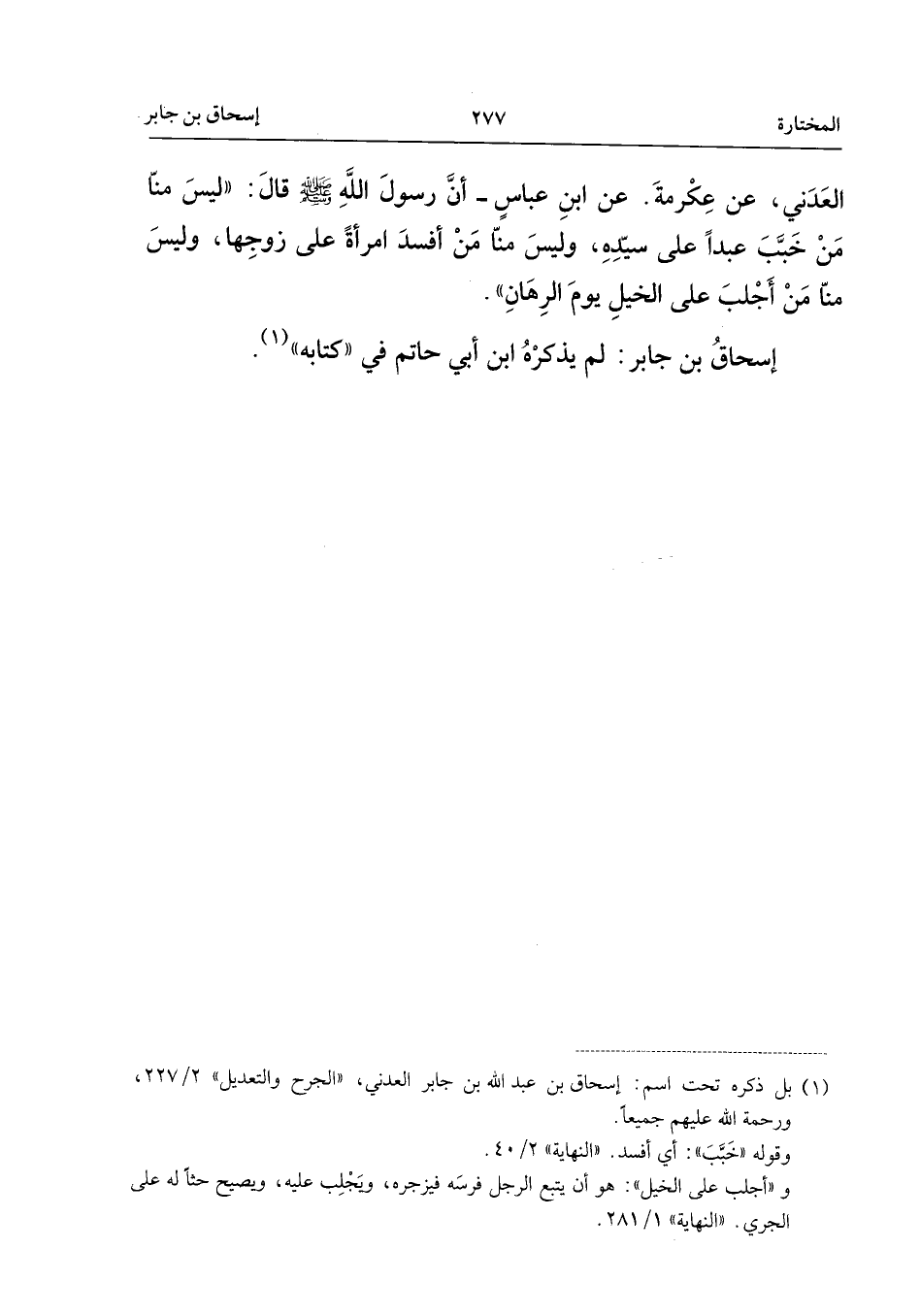 الْعَدَنِيِّ، عَنْ عِكْرِمَةَ، عَنِ ابْن عَبَّاس، أَنَّ رَسُولَ اللَّهِ صَلَّى اللَّهُ عَلَيْهِ وَسَلَّمَ، قَالَ: «لَيْسَ مِنَّا مَنْ خَبَّبَ عَبْدًا عَلَى سَيِّدِهِ، وَلَيْسَ مِنَّا مَنْ أَفْسَدَ امْرَأَةً عَلَى زَوْجِهَا، وَلَيْسَ مِنَّا مَنْ أَجْلَبَ عَلَى الْخَيْلِ يَوْمَ الرِّهَانِ» ، إِسْحَاقُ بْنُ جَابِرٍ: لَمْ يَذْكُرْهُ ابْنُ أَبِي حَاتِمٍ فِي كِتَابِهِ
