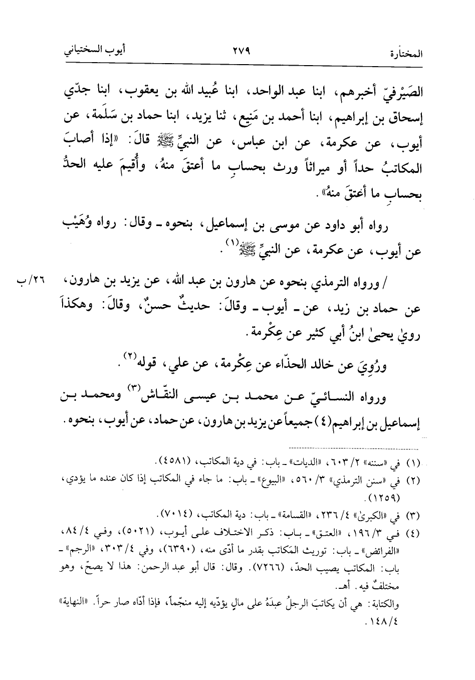 الصَّيْرَفِيَّ أَخْبَرَهُمْ، أبنا عَبْدُ الْوَاحِدِ، أبنا عُبَيْدُ اللَّهِ بْنُ يَعْقُوبَ، أبنا جَدِّي إِسْحَاقُ بْنُ إِبْرَاهِيمَ، أبنا أَحْمَدُ بْنُ مَنِيعٍ، ثَنَا يَزِيدُ، أبنا حَمَّادُ بْنُ سَلَمَةَ، عَنْ أَيُّوبَ، عَنْ عِكْرِمَةَ، عَنِ ابْن عَبَّاس، عَنِ النَّبِيِّ صَلَّى اللَّهُ عَلَيْهِ وَسَلَّمَ، قَالَ: «إِذَا أَصَابَ الْمُكَاتِبُ حَدًّا أَوْ مِيرَاثًا وَرِثَ بِحِسَابِ مَا أَعْتَقَ مِنْهُ، وَأُقِيمَ عَلَيْهِ الْحَدُّ بِحِسَابِ مَا أَعْتَقَ مِنْهُ» .