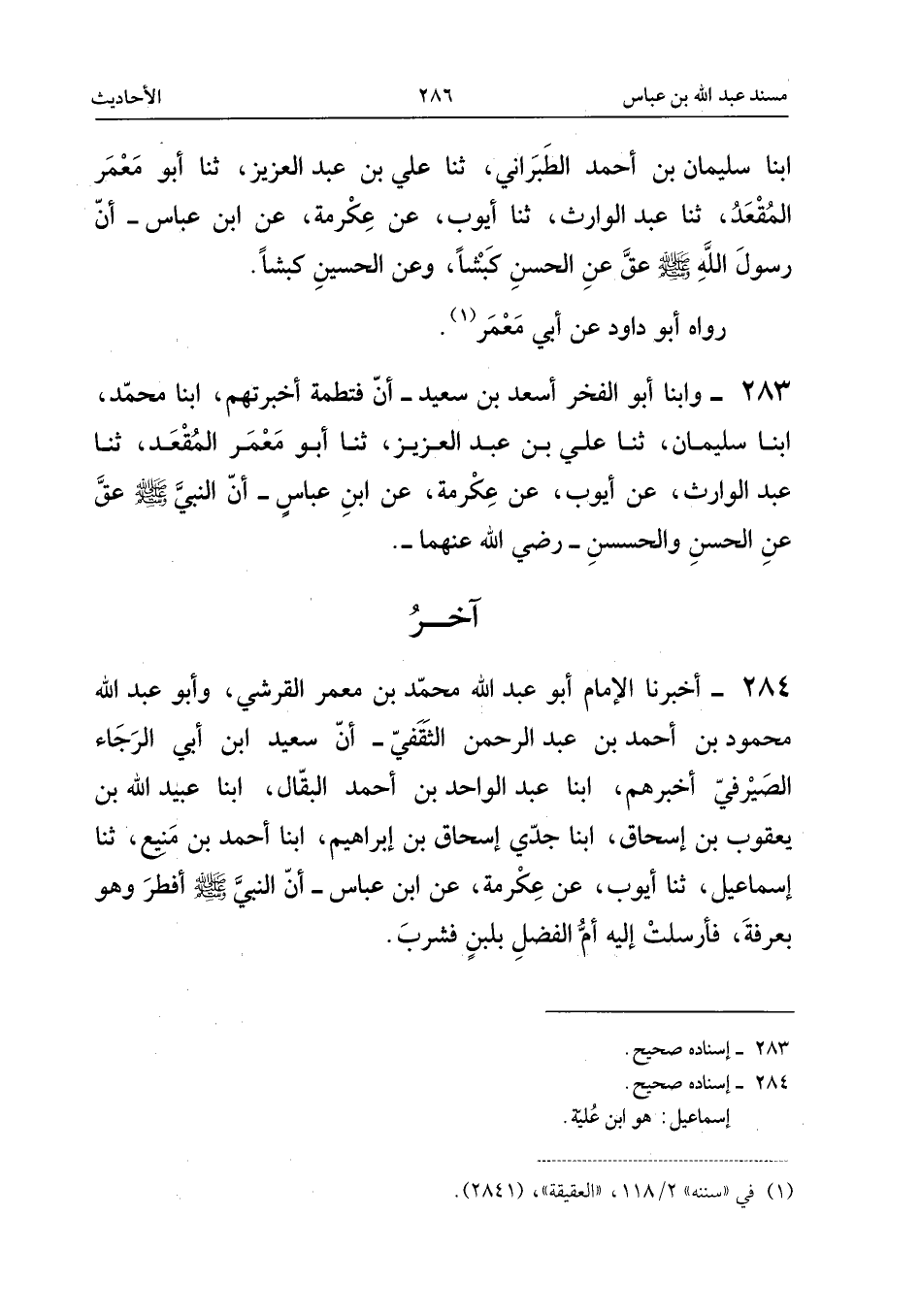 283 - وَأبنا أَبُو الْفَخْرِ أَسْعَدُ بْنُ سَعِيدٍ، أَنَّ فَاطِمَةَ أَخْبَرَتْهُمْ، أبنا مُحَمَّدٌ، أبنا سُلَيْمَانُ، ثَنَا عَلِيُّ بْنُ عَبْدِ الْعَزِيزِ، ثَنَا أَبُو مَعْمَرٍ الْمُقْعَدُ، ثَنَا عَبْدُ الْوَارِثِ، عَنْ أَيُّوبَ، عَنْ عِكْرِمَةَ، عَنِ ابْن عَبَّاس، أَنَّ النَّبِيَّ صَلَّى اللَّهُ عَلَيْهِ وَسَلَّمَ عَقَّ عَنِ الْحَسَنِ وَالْحُسَيْنِ، رَضِيَ اللَّهُ عَنْهُمَا