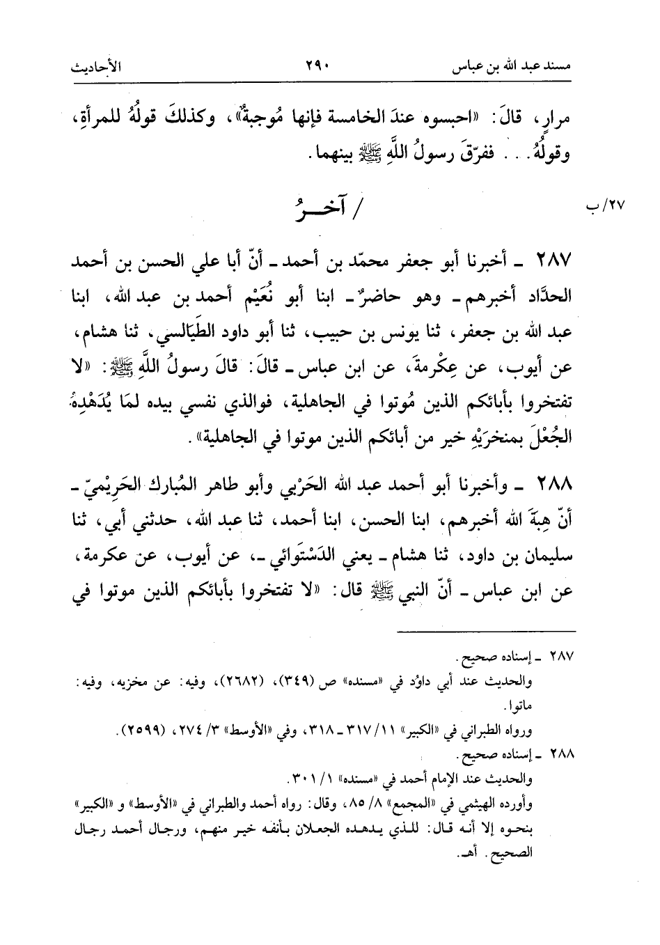 288 - وَأَخْبَرَنَا أَبُو أَحْمَدَ عَبْدُ اللَّهِ الْحَرْبِيُّ وَأَبُو طَاهِرٍ الْمُبَارَكُ الْحَرِيمِيُّ، أَنَّ هِبَةَ اللَّهِ أَخْبَرَهُمْ، أبنا الْحَسَنُ، أبنا أَحْمَدُ، ثَنَا عَبْدُ اللَّهِ، حَدَّثَنِي أَبِي، ثَنَا سُلَيْمَانُ بْنُ دَاوُدَ، ثَنَا هِشَامٌ، يَعْنِي الدَّسْتُوَائِيَّ، عَنْ أَيُّوبَ، عَنْ عِكْرِمَةَ، عَنِ ابْن عَبَّاس، أَنَّ النَّبِيَّ صَلَّى اللَّهُ عَلَيْهِ وَسَلَّمَ قَالَ: «لَا تَفْتَخِرُوا بِآبَائِكُمُ الَّذِينَ مَاتُوا فِي